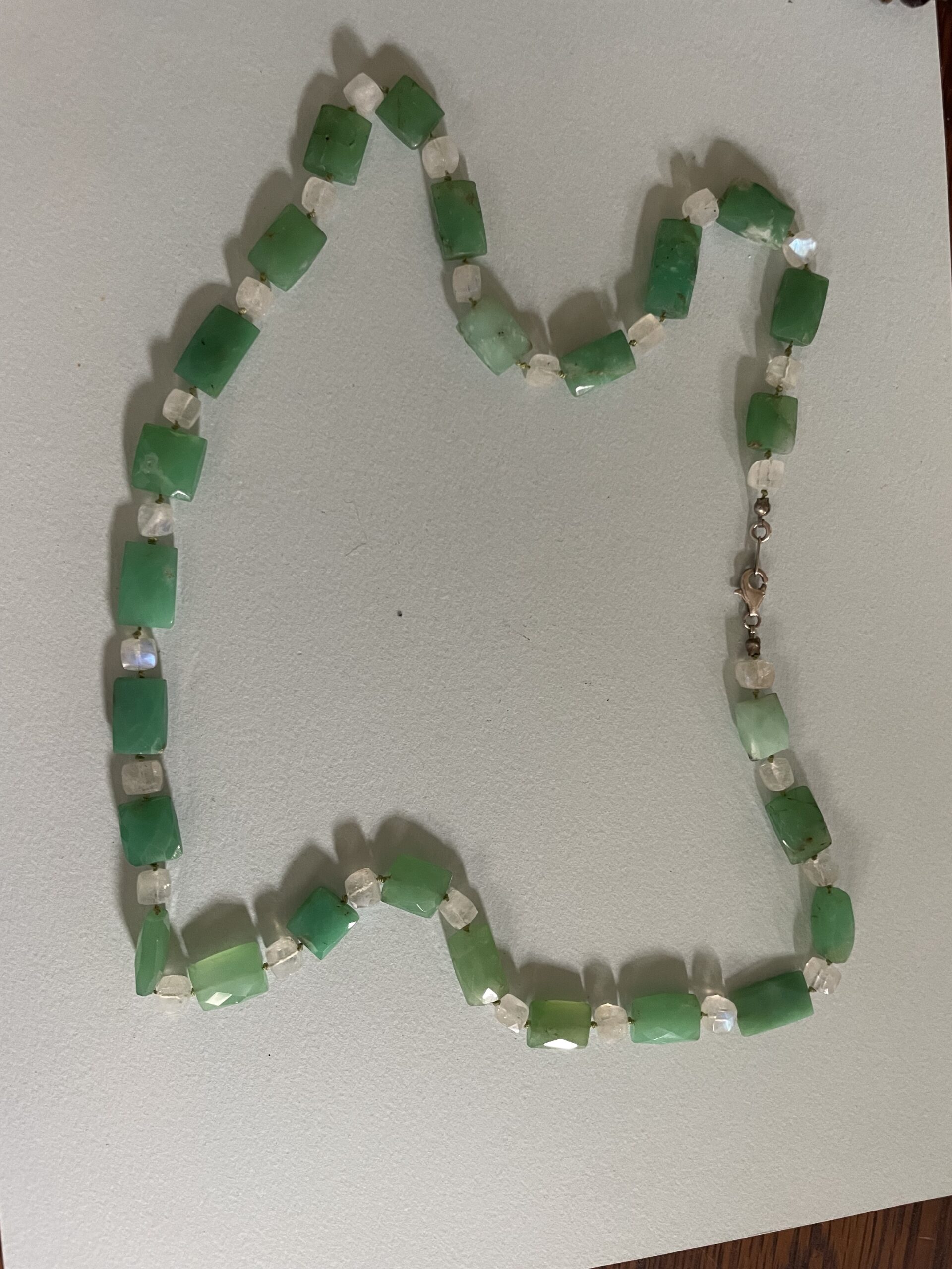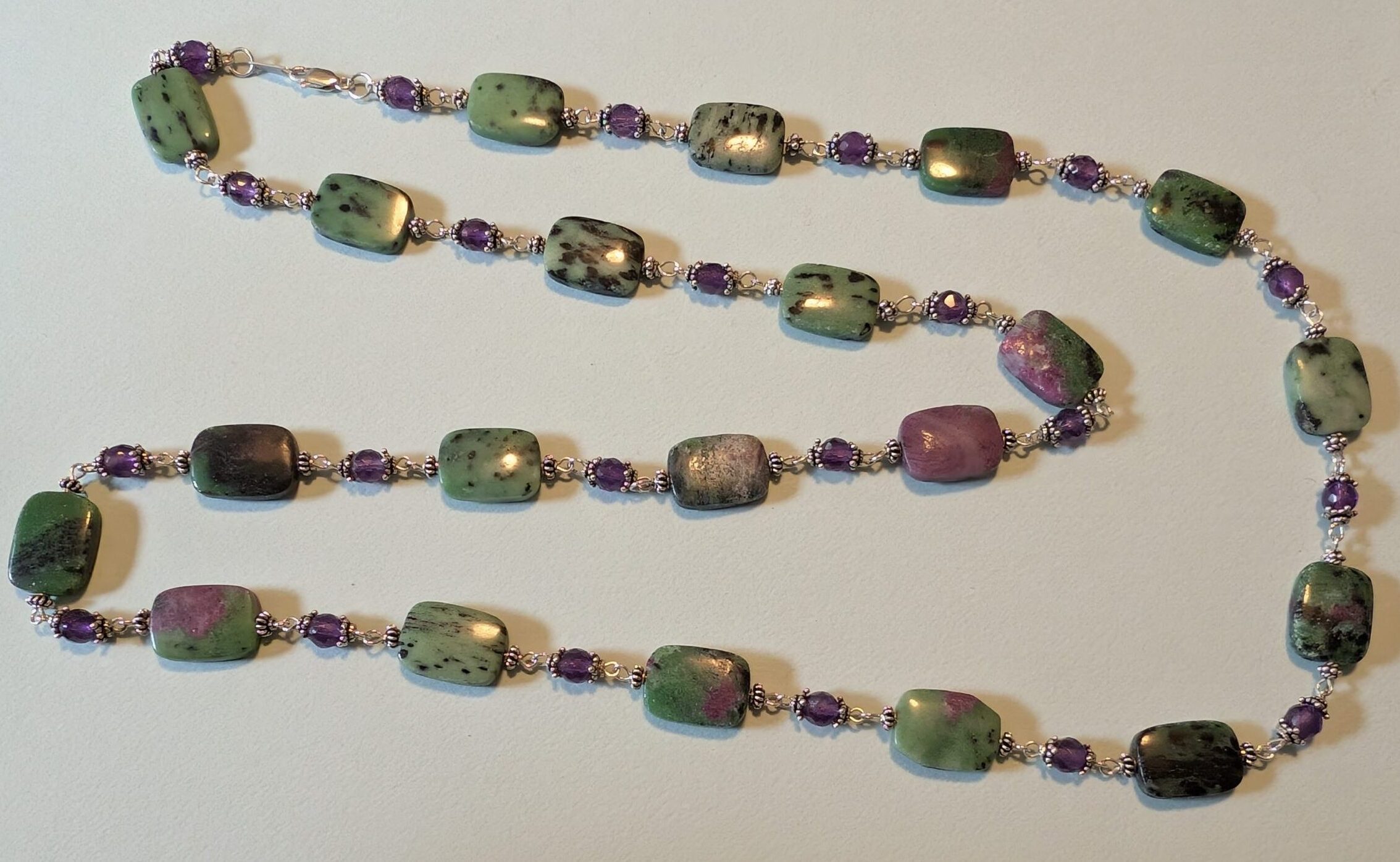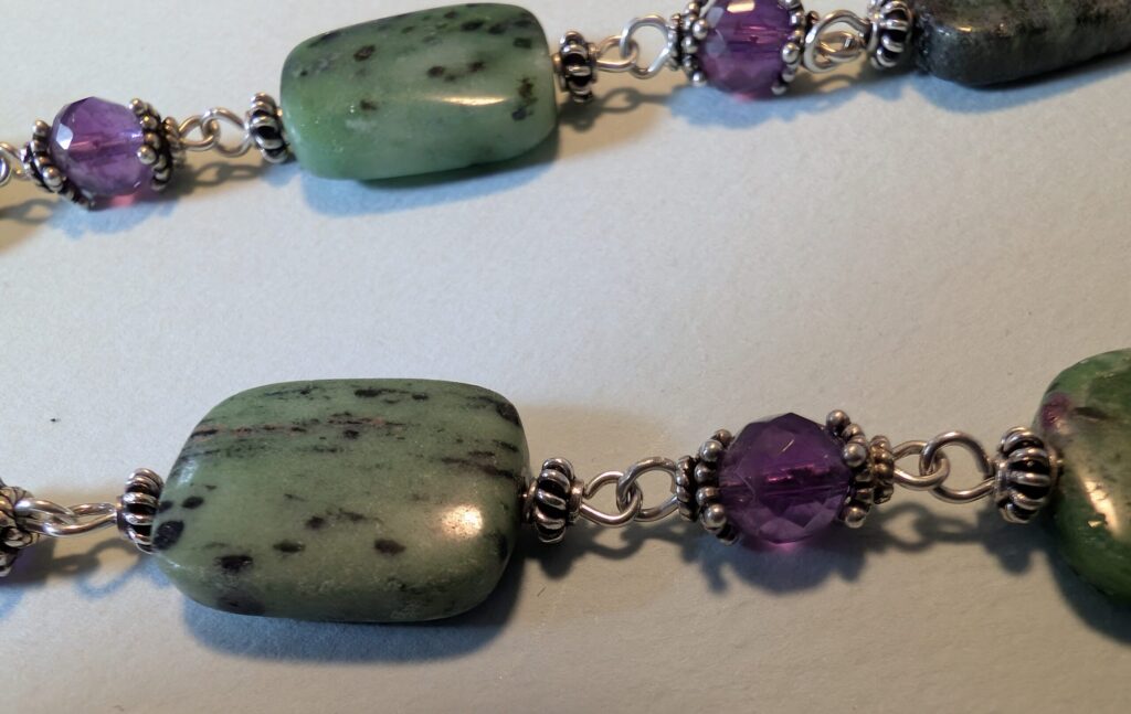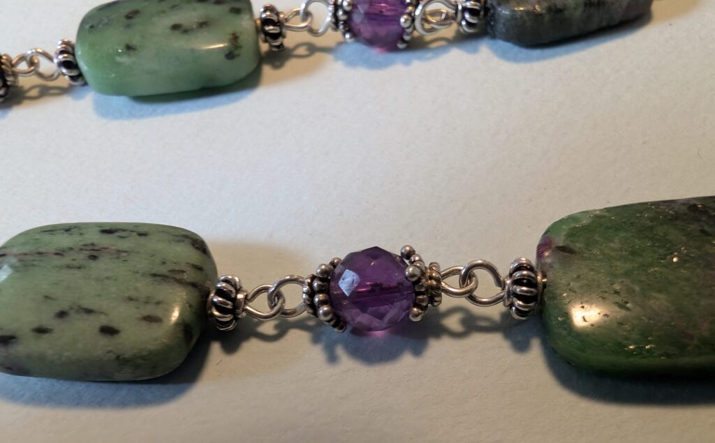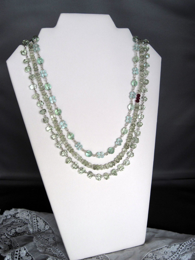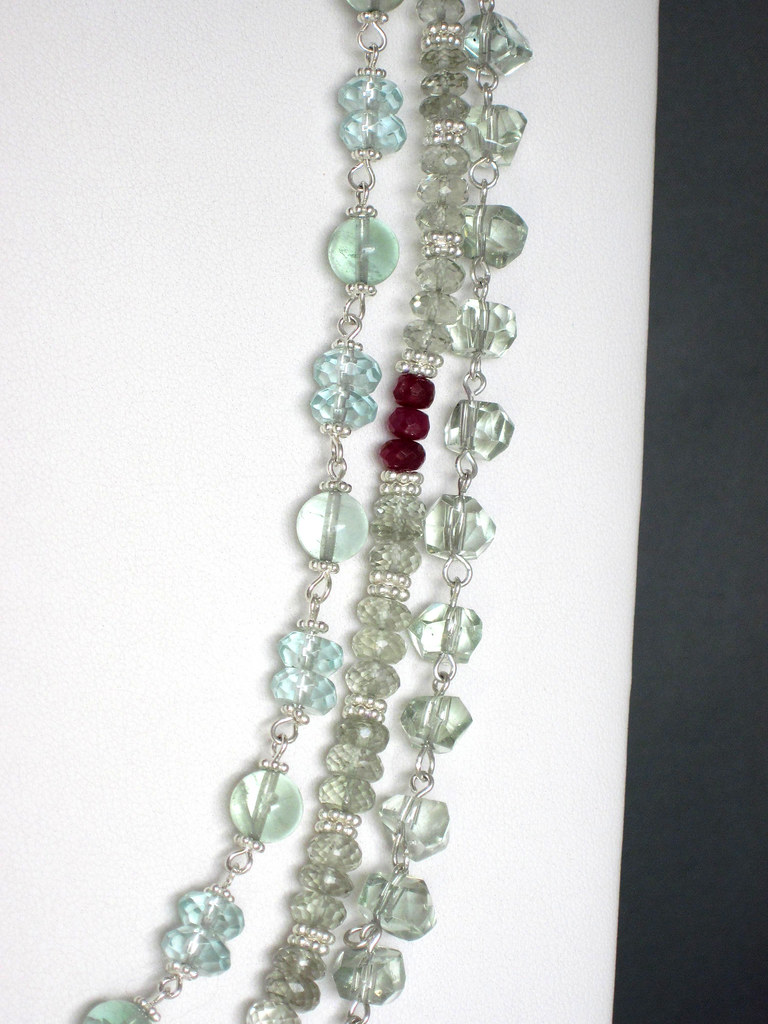 Three strand necklace made with sterling silver wire and findings, nylon thread, with semi-precious gemstone beads of Aquamarine, Green Amethyst, Aventurine, Prehnite, and raspberry Rubies.