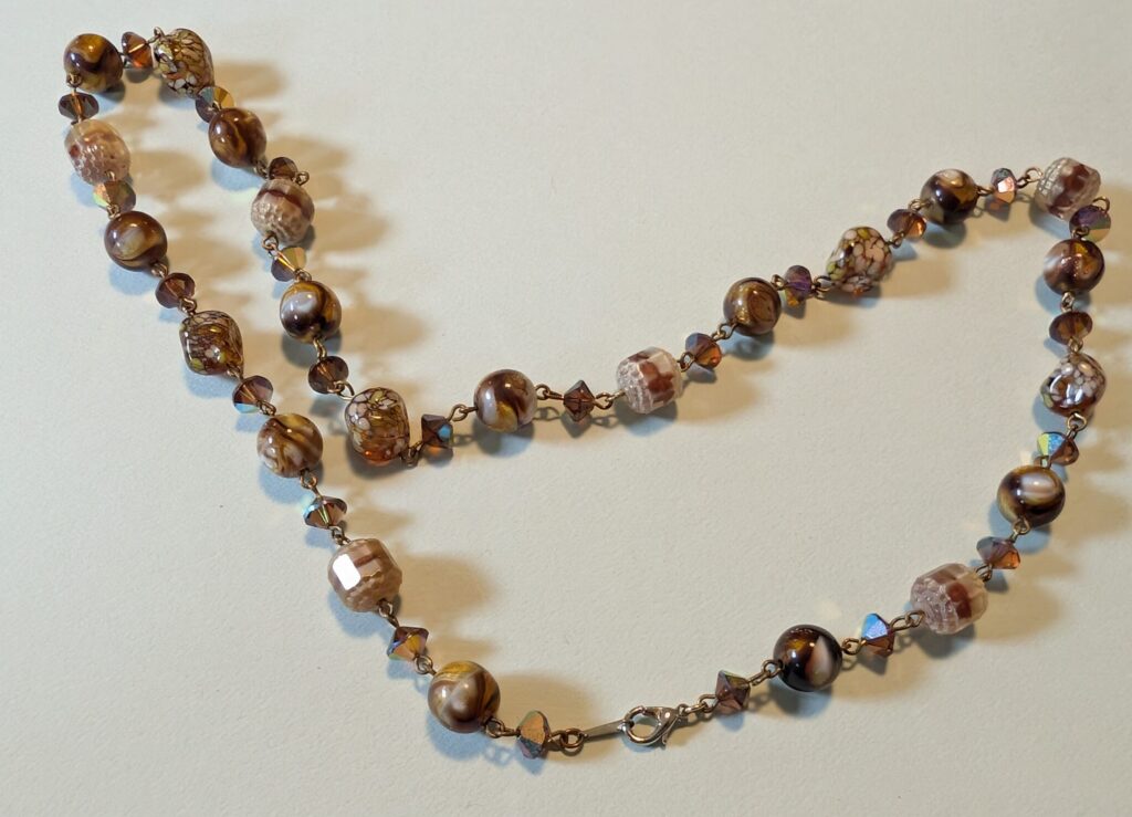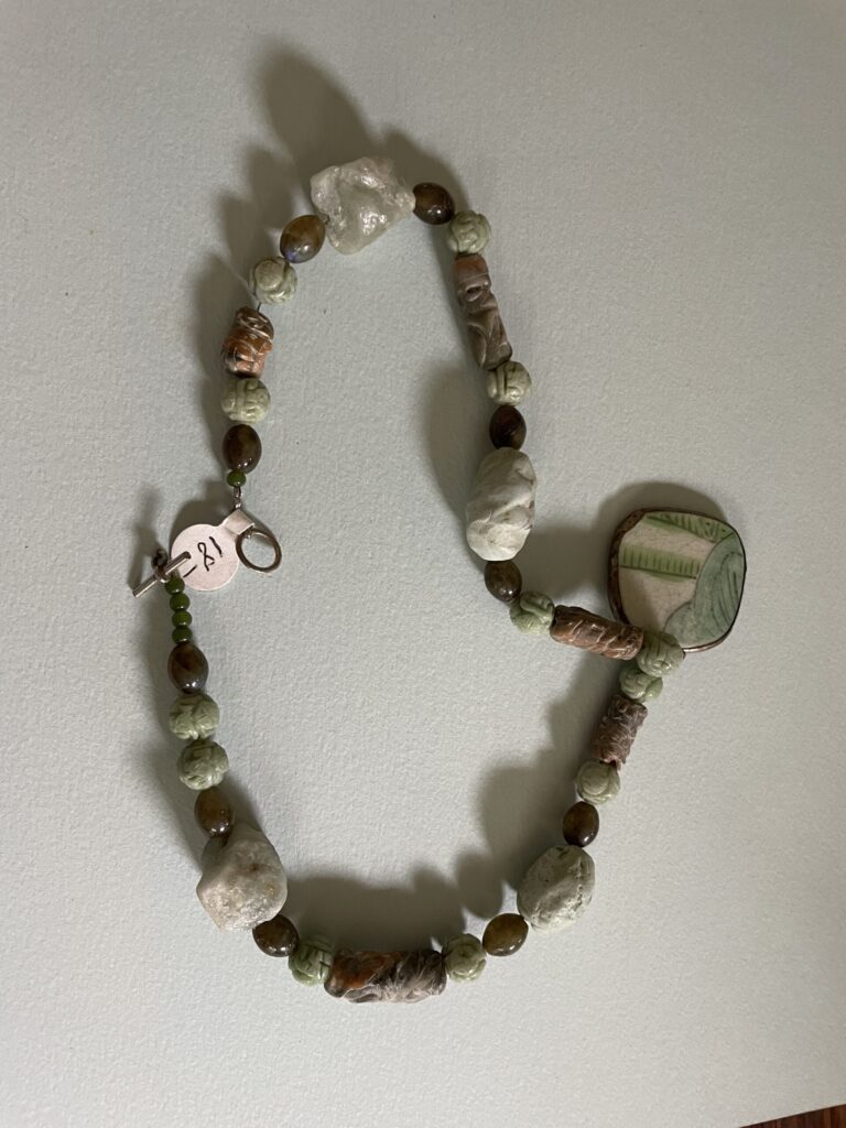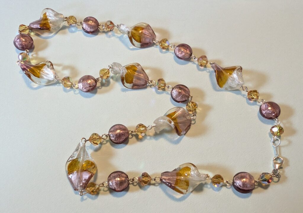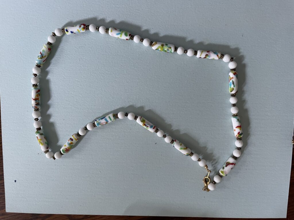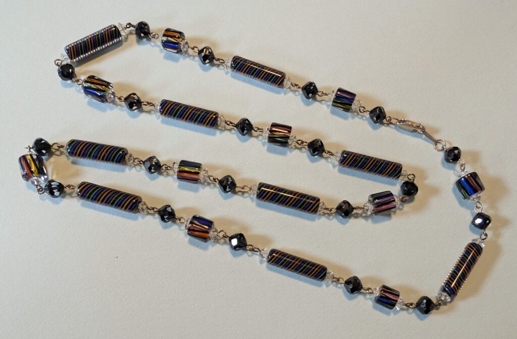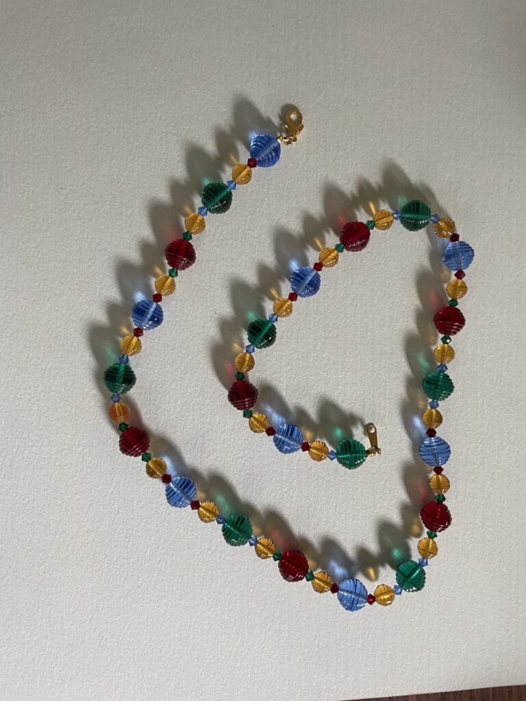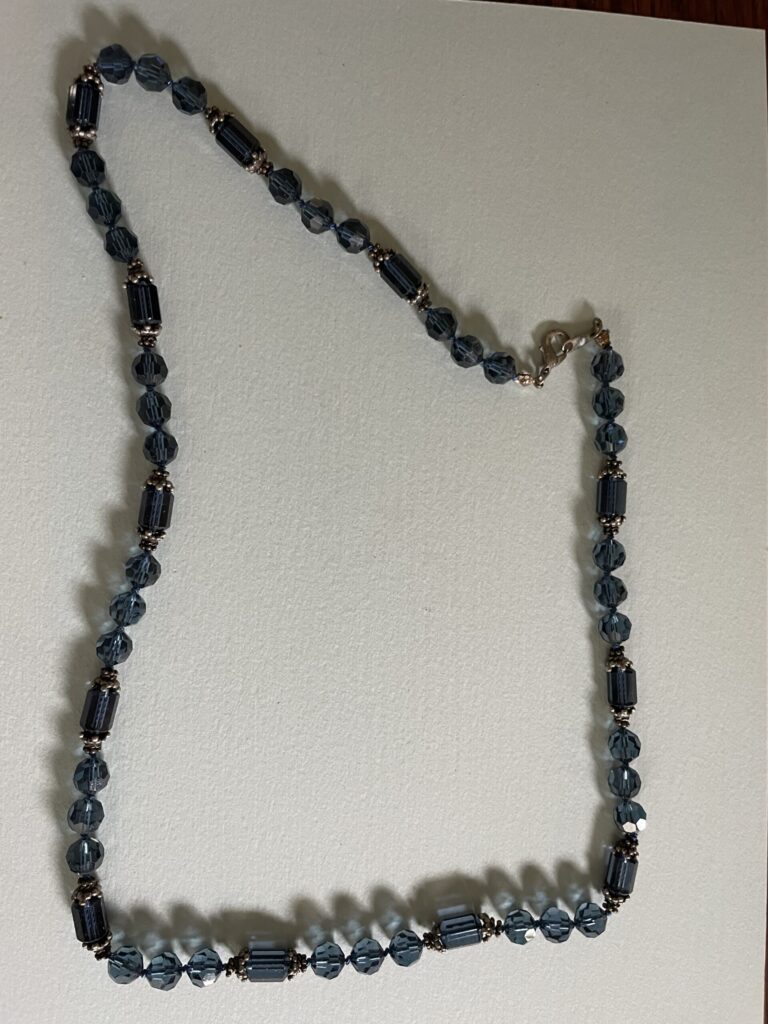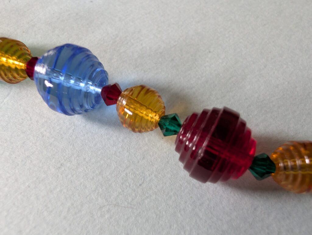 Necklaces are labeled to enable us to keep photos of the same necklace together. Numbers (e.g., “Eureka necklace 1”) have no significance other than the order in which we numbered them — that is, the numbers have no connection whatsoever with when they were made, type of beads, or anything else.