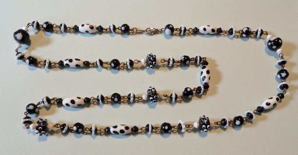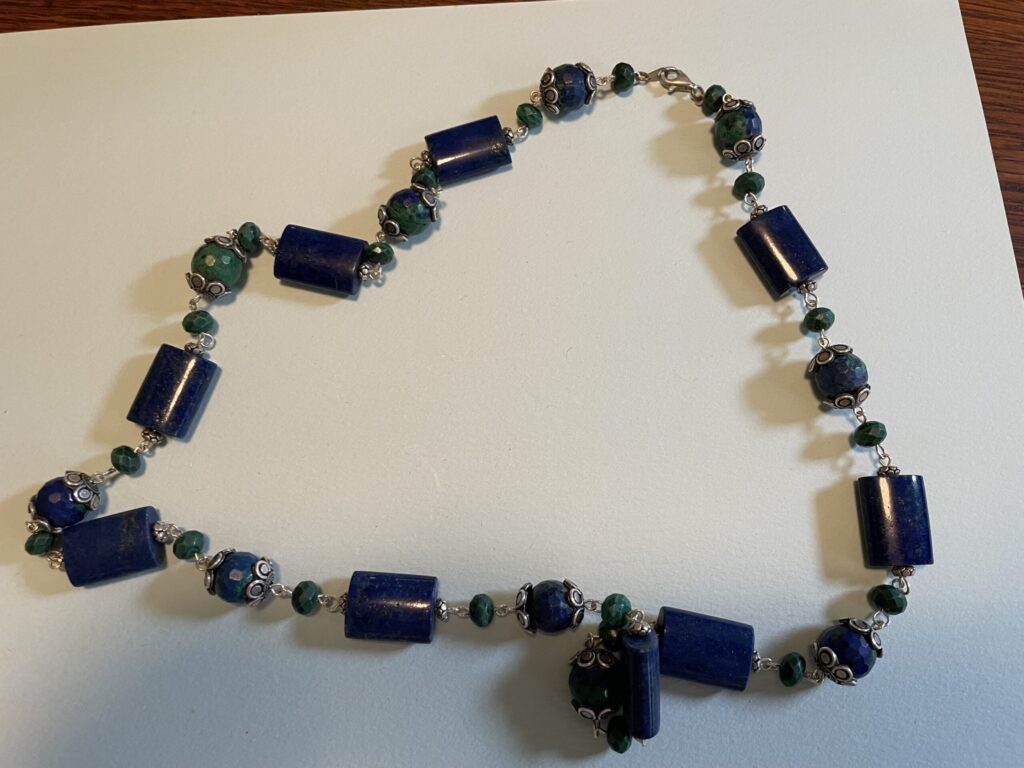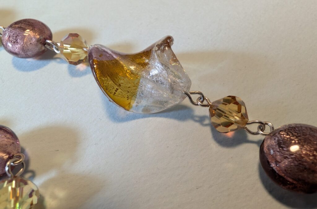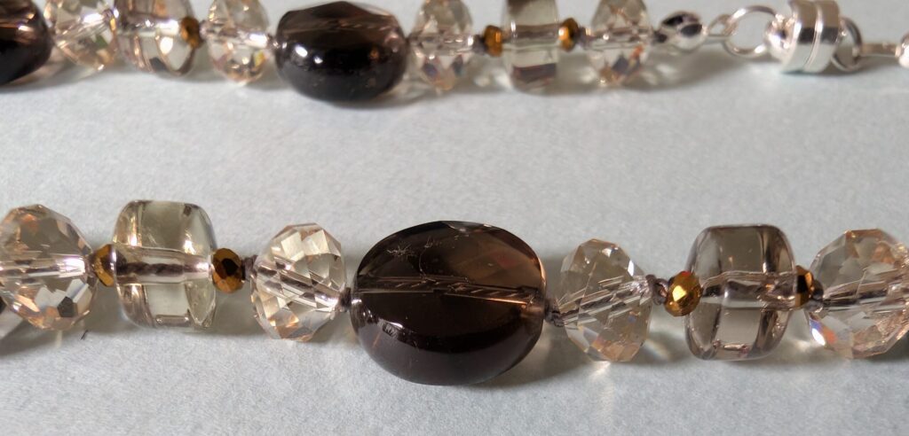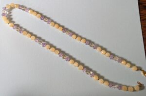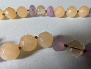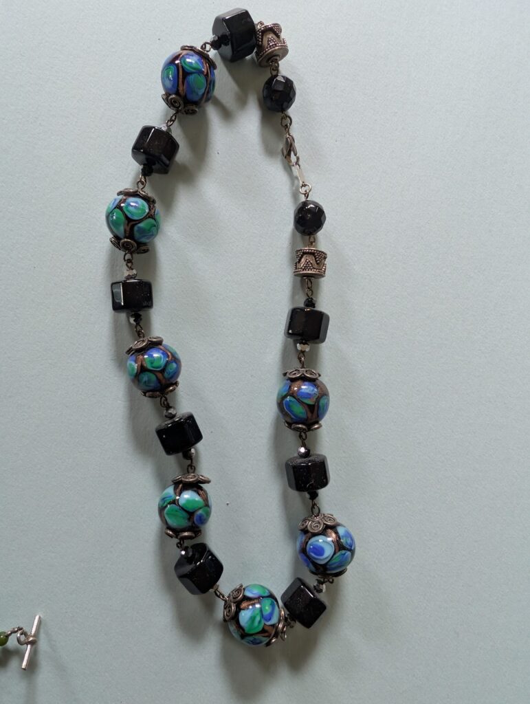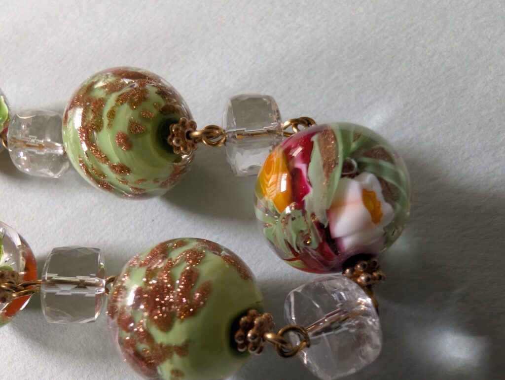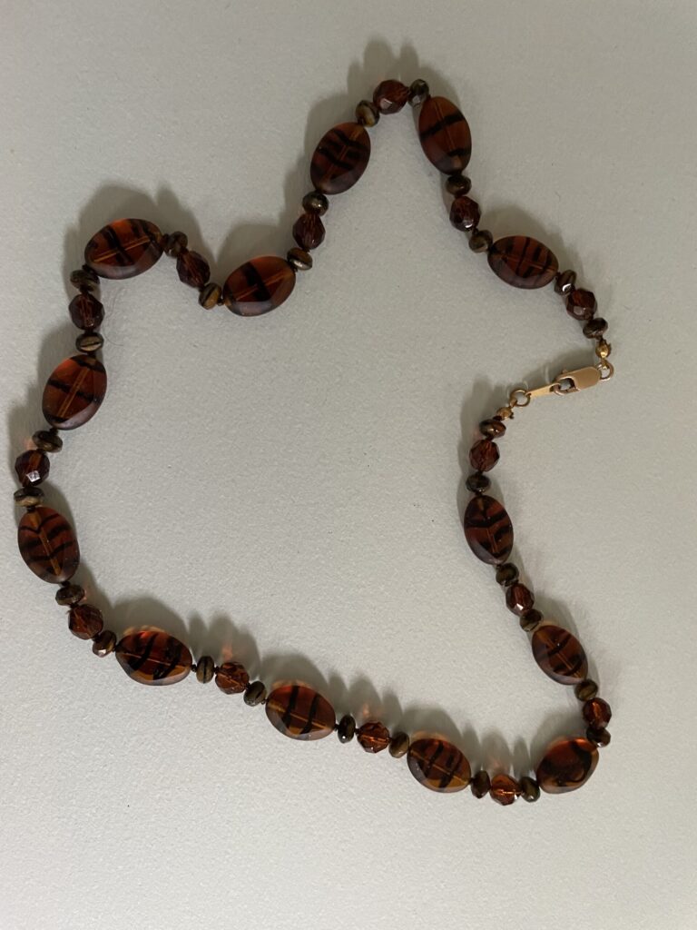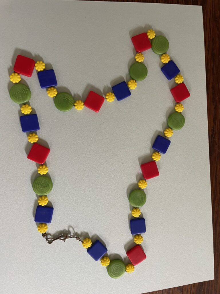 Necklaces are labeled to enable us to keep photos of the same necklace together. Numbers (e.g., “Eureka necklace 1”) have no significance other than the order in which we numbered them — that is, the numbers have no connection whatsoever with when they were made, type of beads, or anything else.
