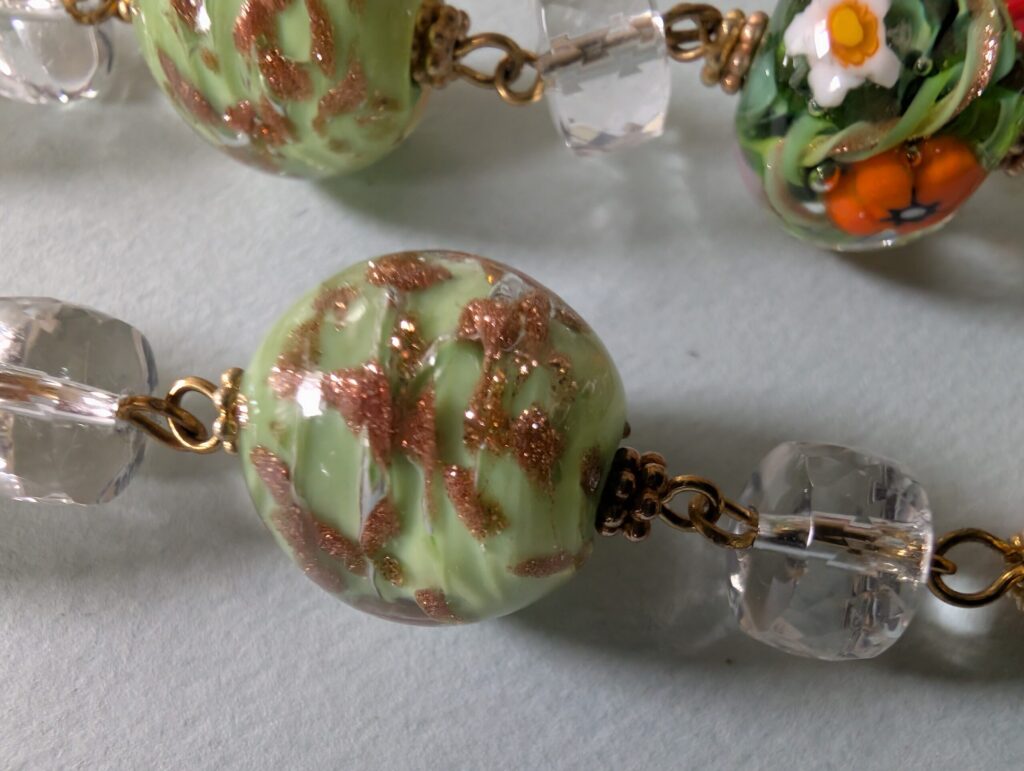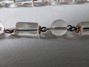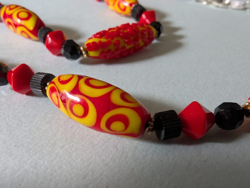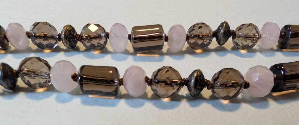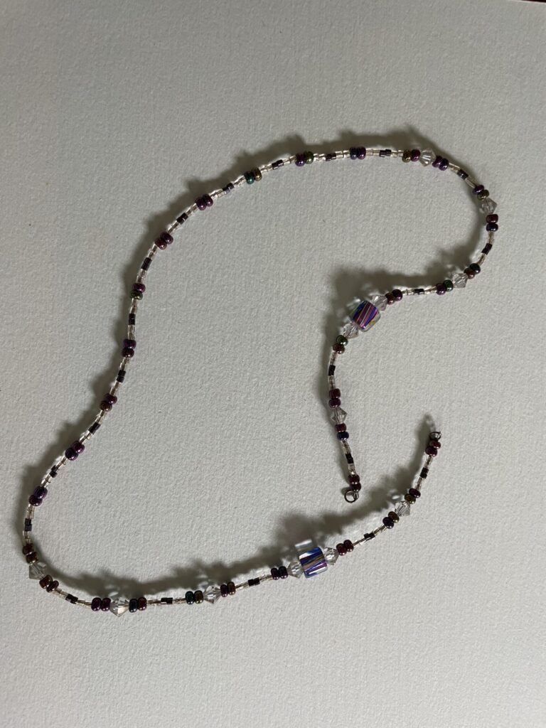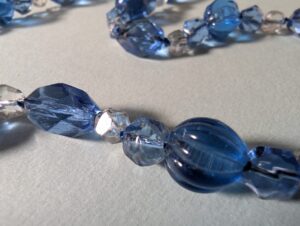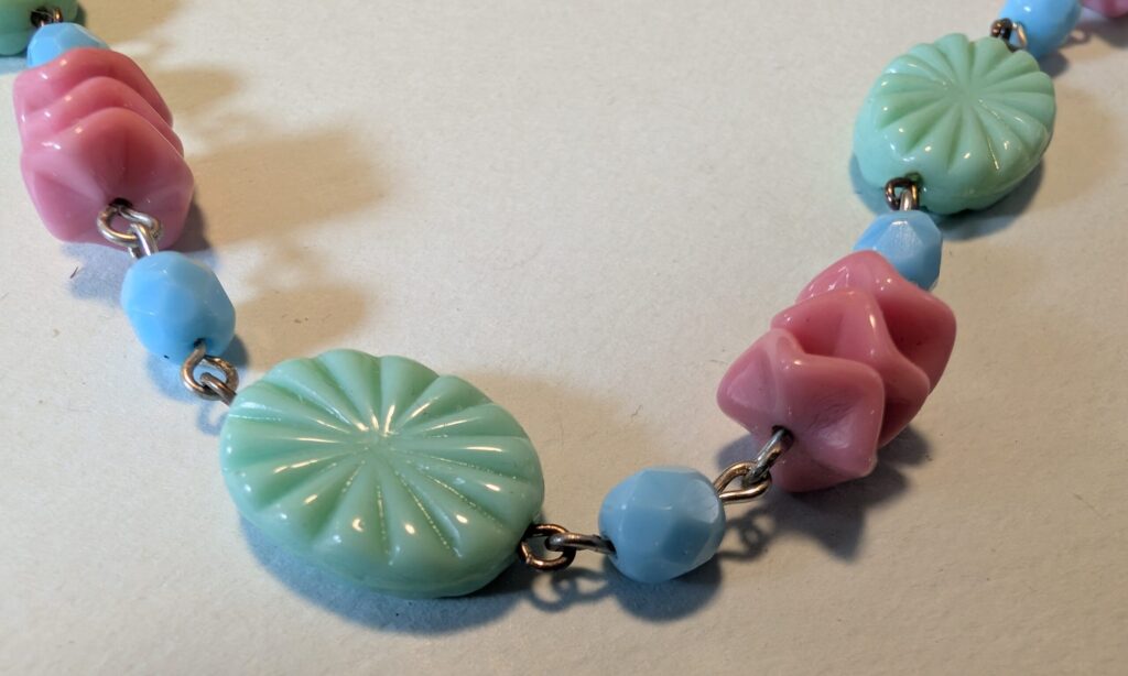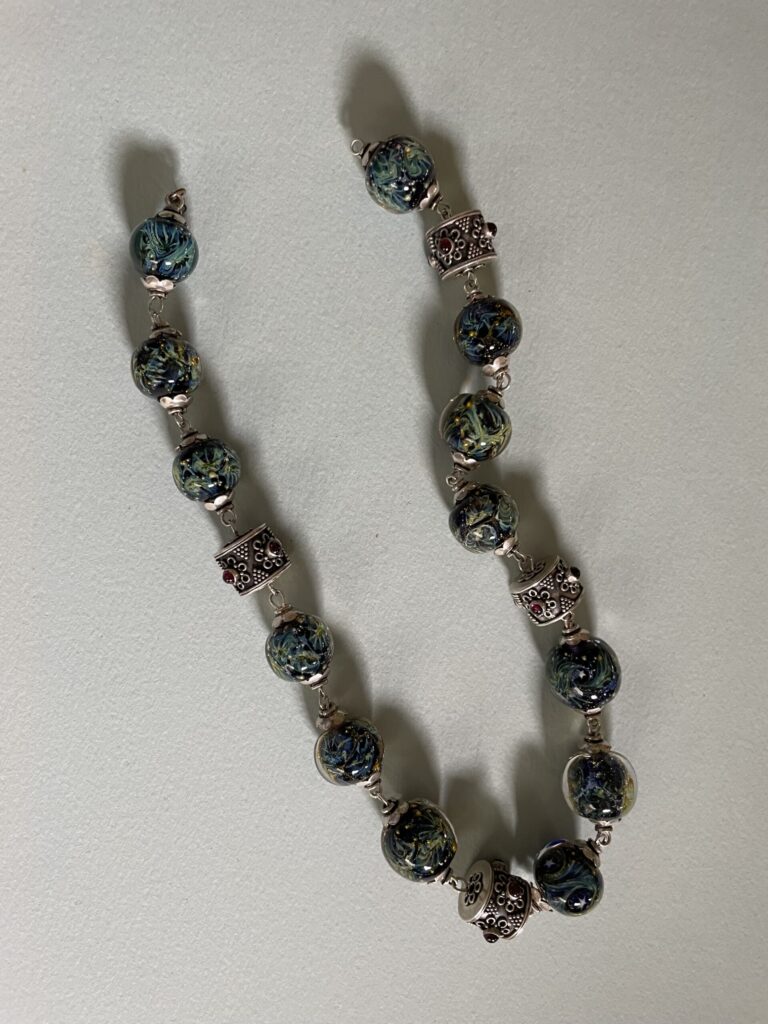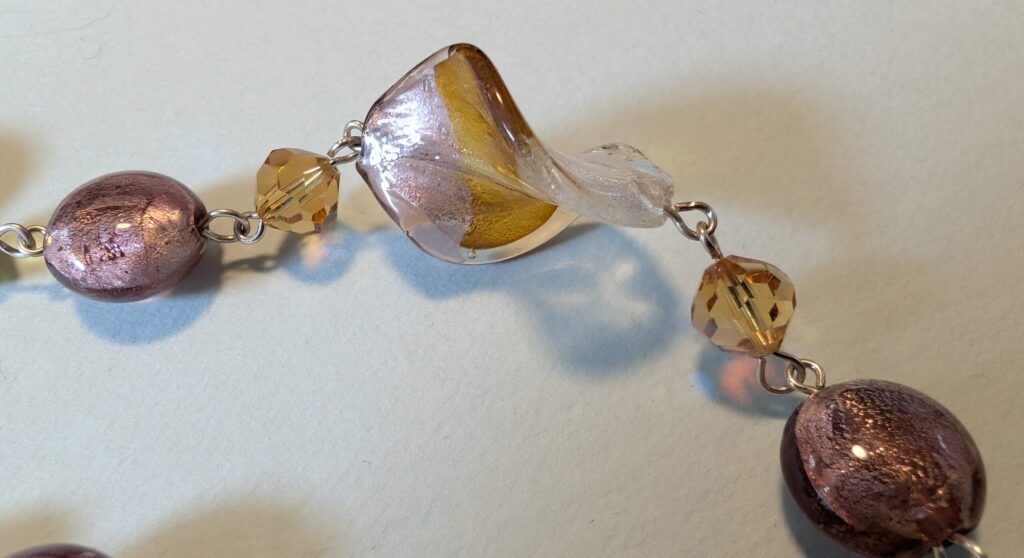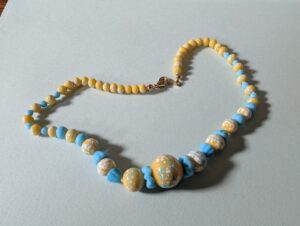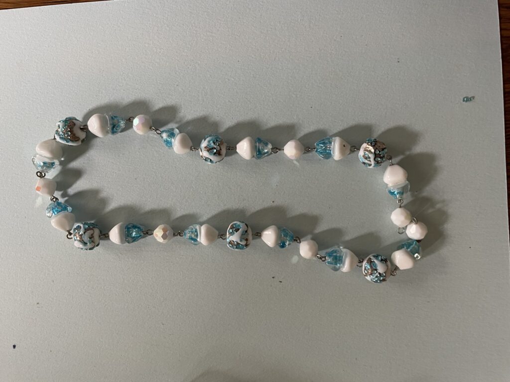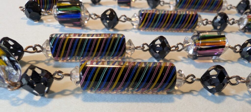 Necklaces are labeled to enable us to keep photos of the same necklace together. Numbers (e.g., “Eureka necklace 1”) have no significance other than the order in which we numbered them — that is, the numbers have no connection whatsoever with when they were made, type of beads, or anything else.