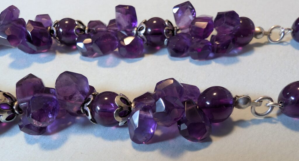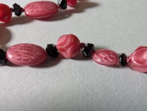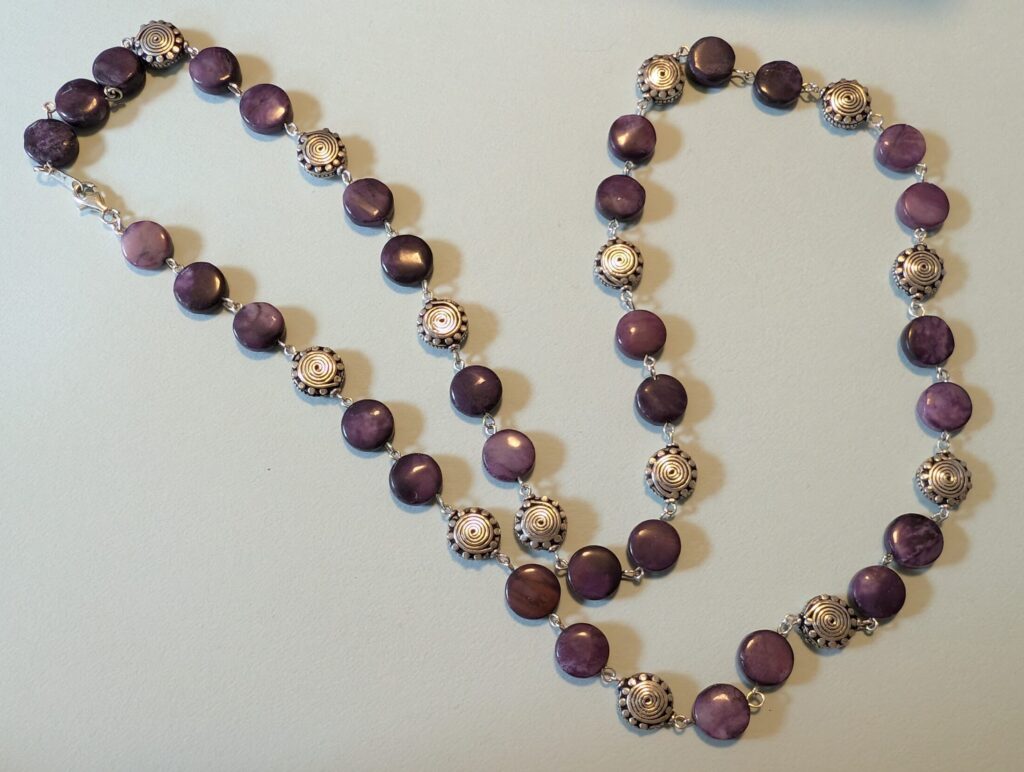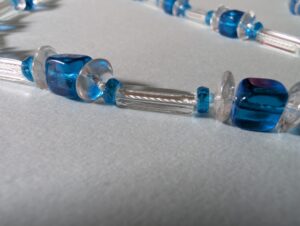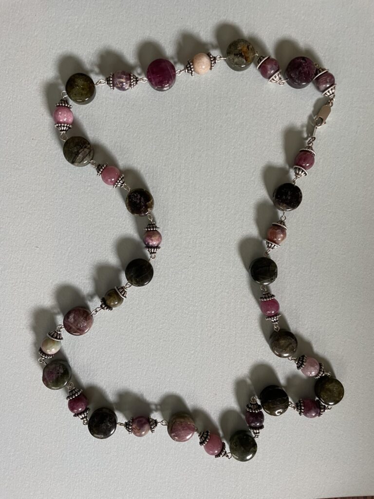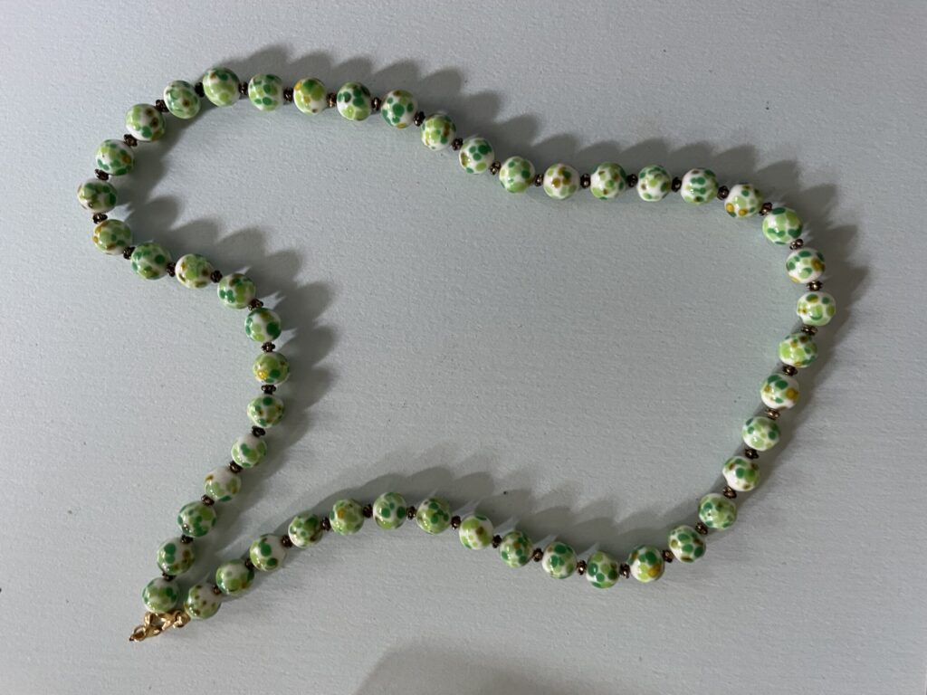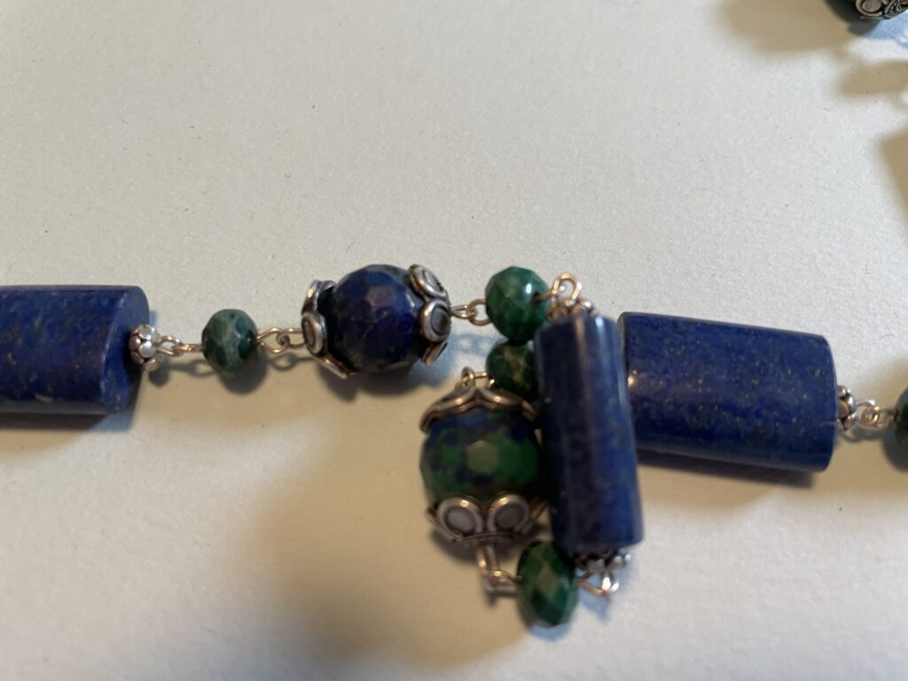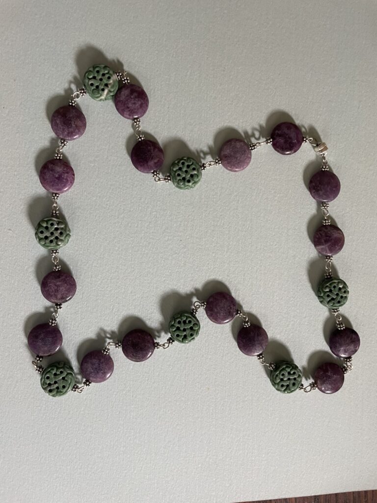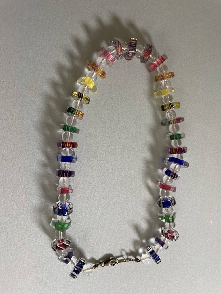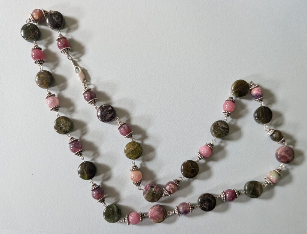 Necklaces are labeled to enable us to keep photos of the same necklace together. Numbers (e.g., “Eureka necklace 1”) have no significance other than the order in which we numbered them — that is, the numbers have no connection whatsoever with when they were made, type of beads, or anything else.