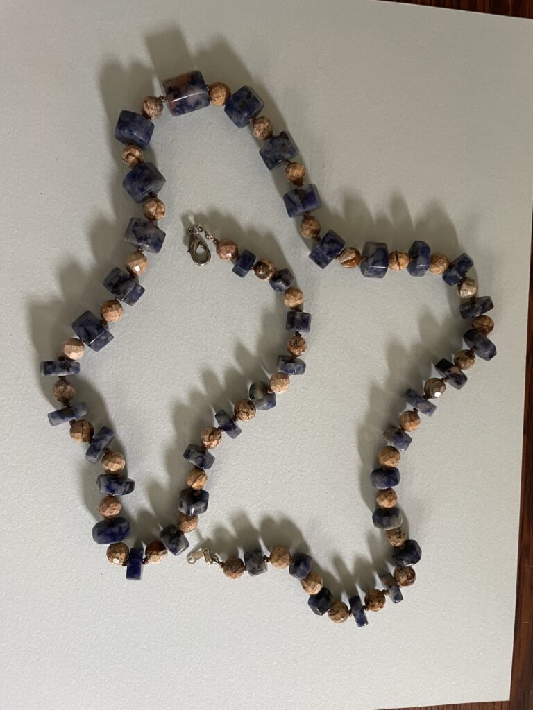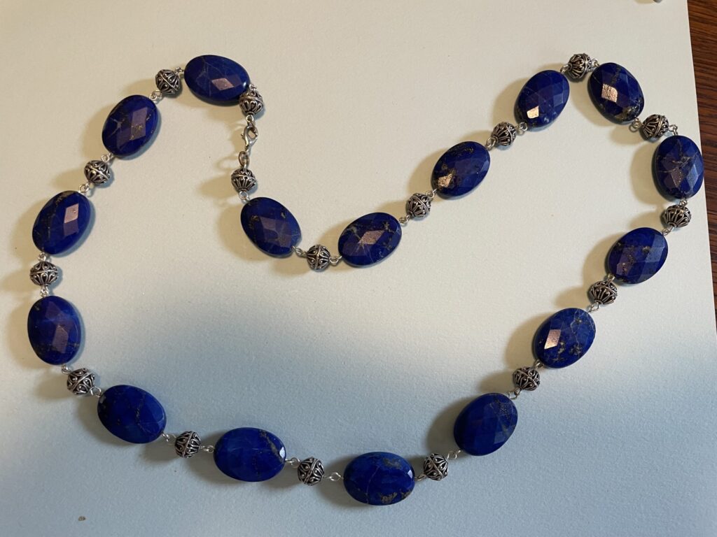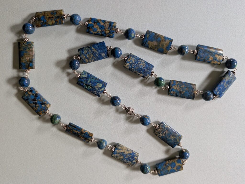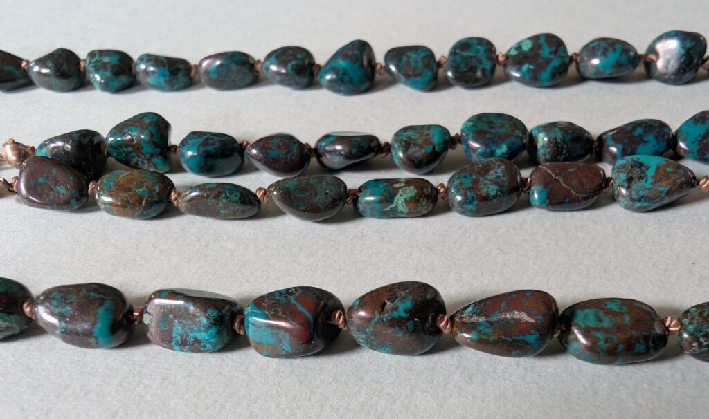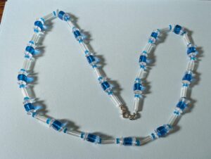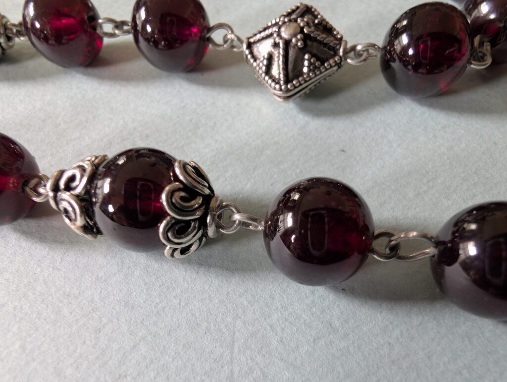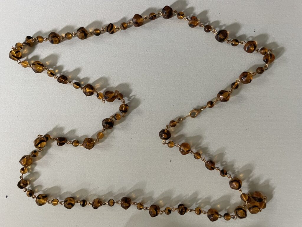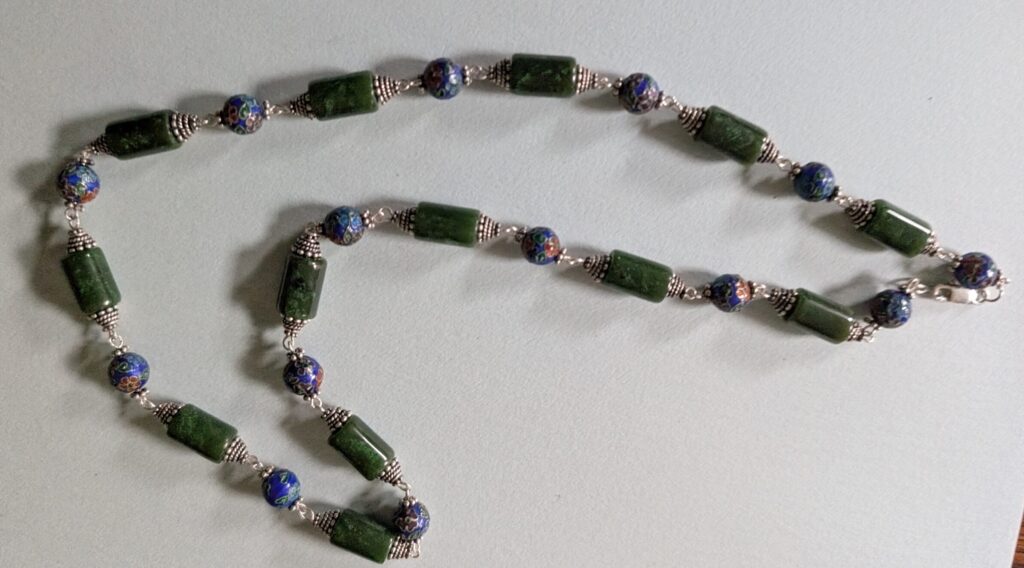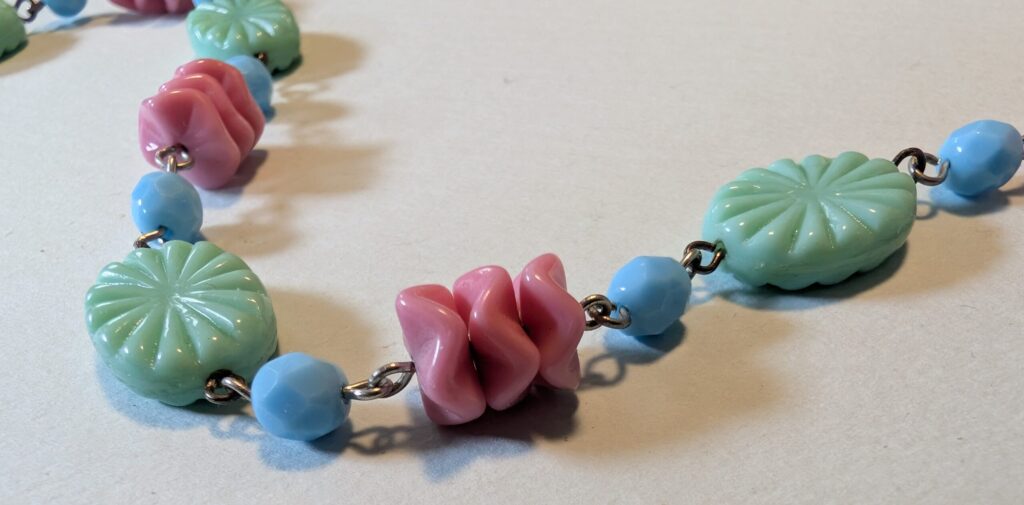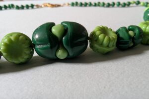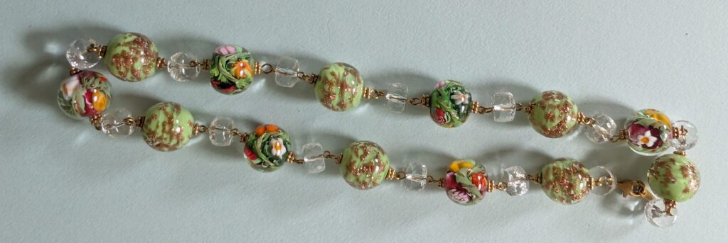 Necklaces are labeled to enable us to keep photos of the same necklace together. Numbers (e.g., “Eureka necklace 1”) have no significance other than the order in which we numbered them — that is, the numbers have no connection whatsoever with when they were made, type of beads, or anything else.