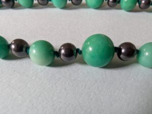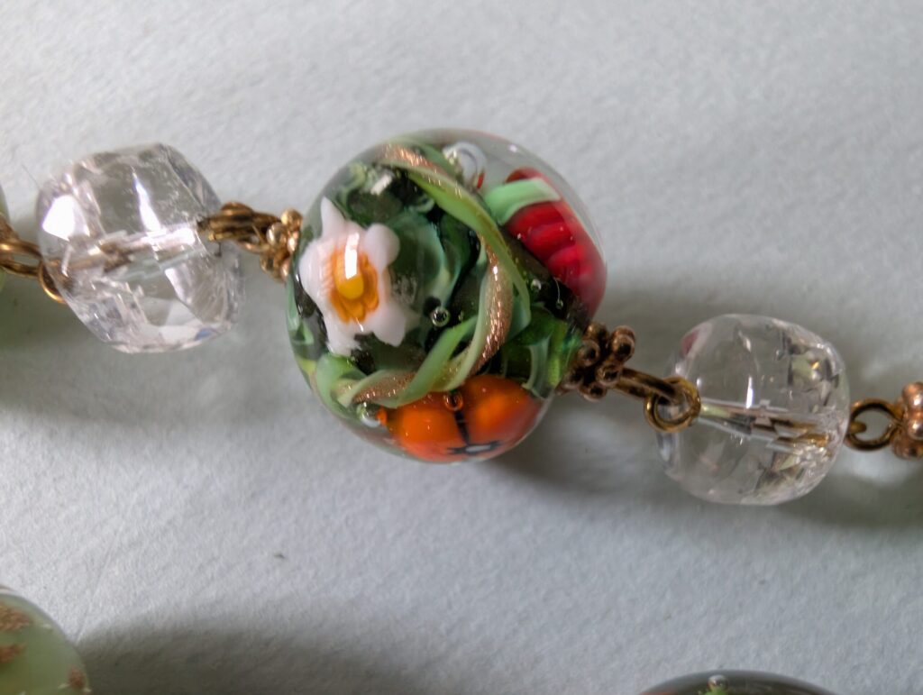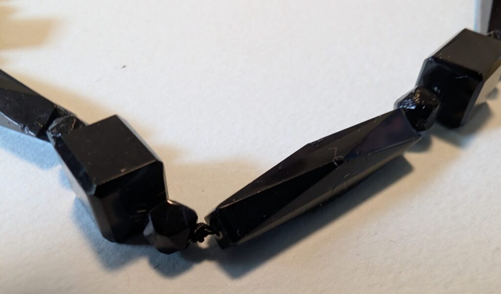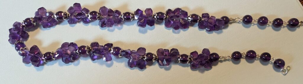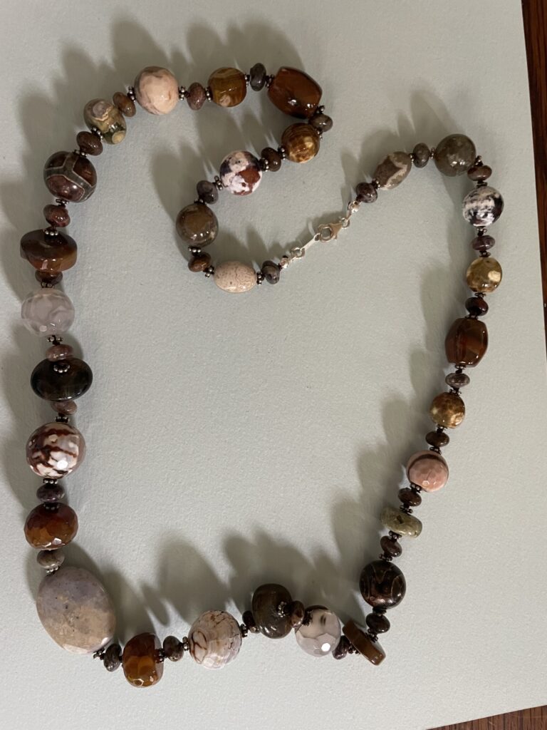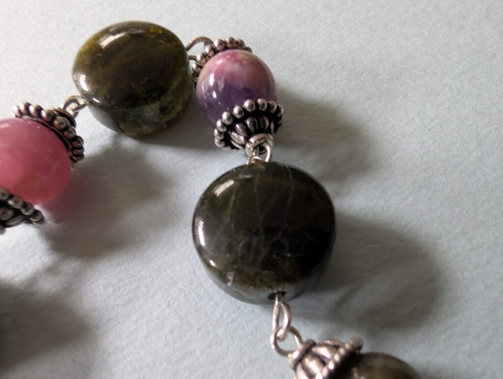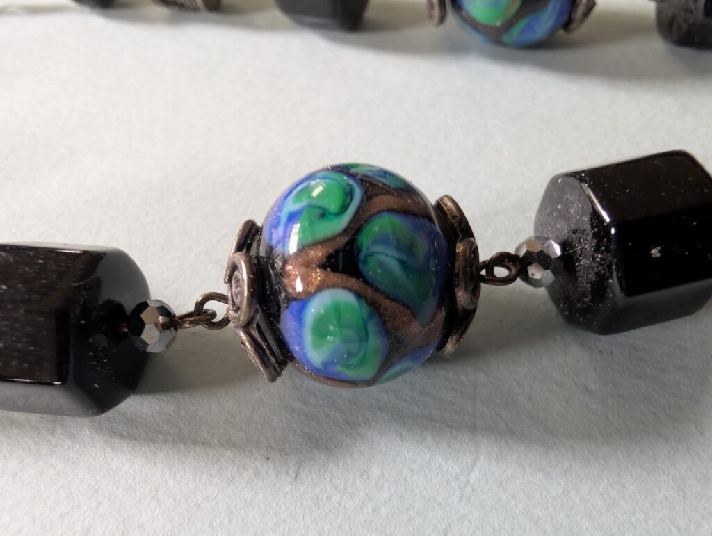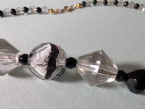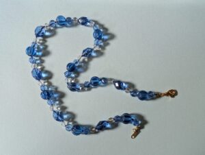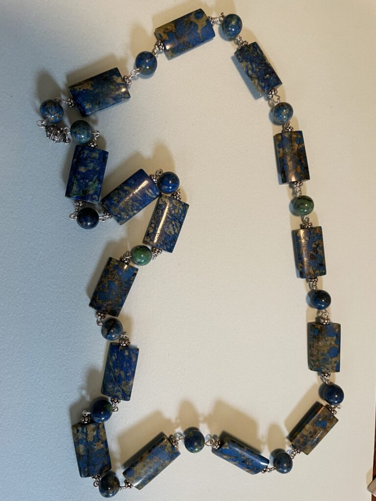 Necklaces are labeled to enable us to keep photos of the same necklace together. Numbers (e.g., “Eureka necklace 1”) have no significance other than the order in which we numbered them — that is, the numbers have no connection whatsoever with when they were made, type of beads, or anything else.