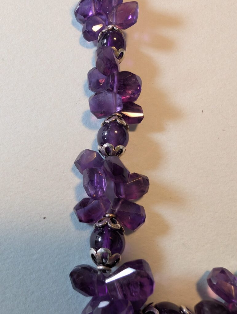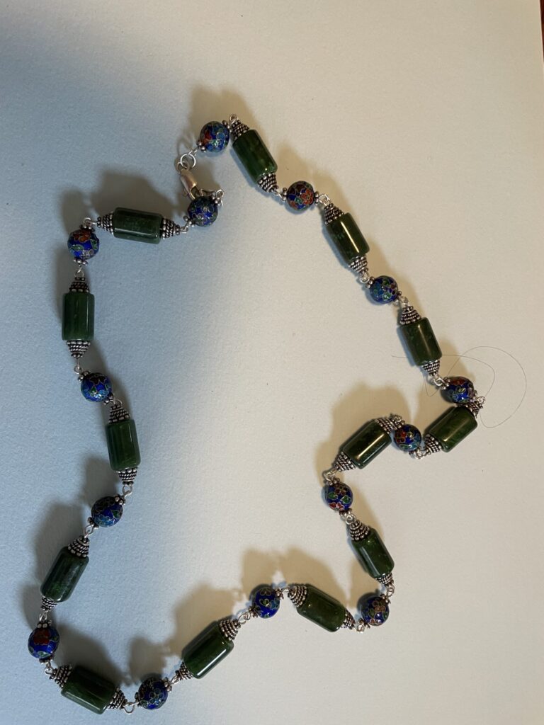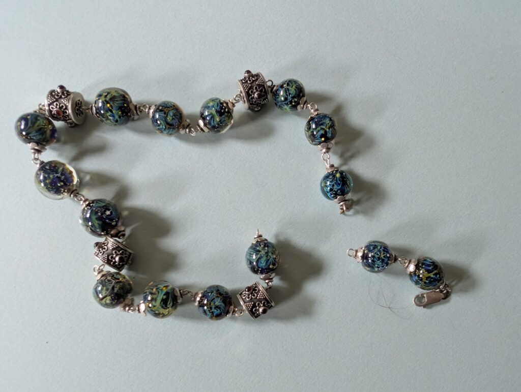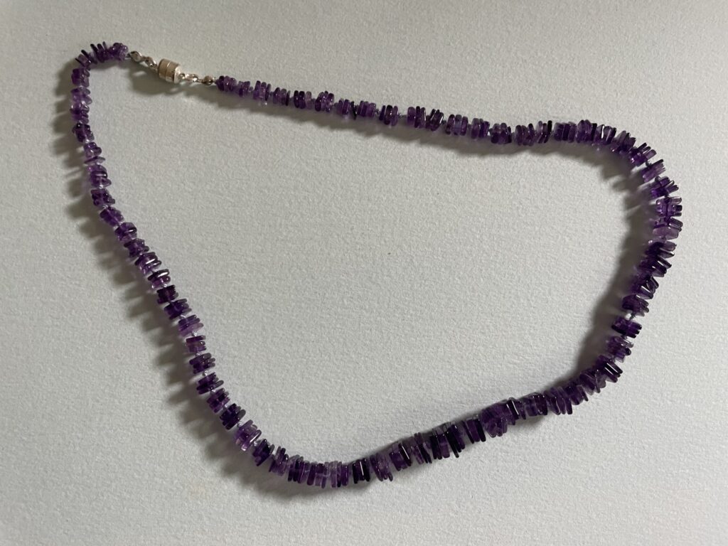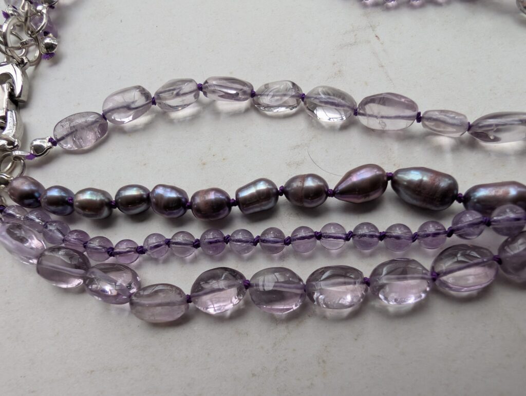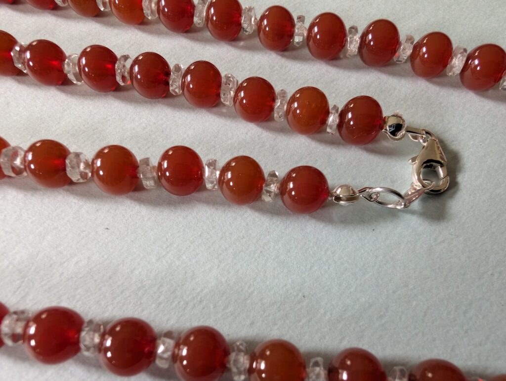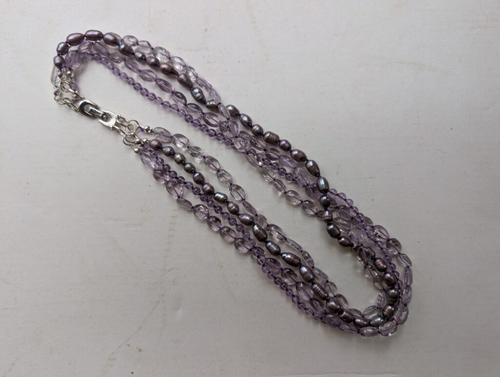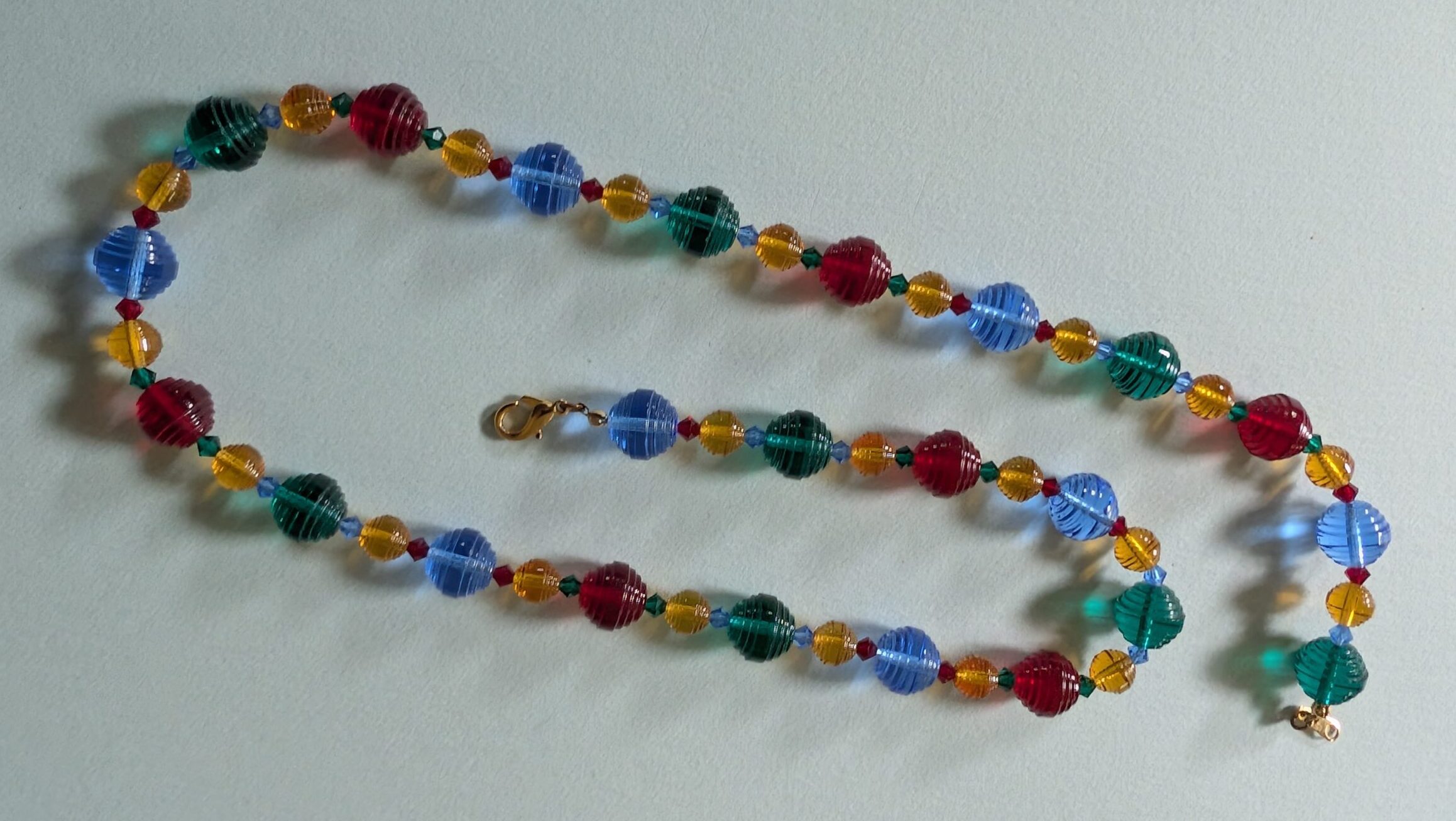 Necklaces are labeled to enable us to keep photos of the same necklace together. Numbers (e.g., “Eureka necklace 1”) have no significance other than the order in which we numbered them — that is, the numbers have no connection whatsoever with when they were made, type of beads, or anything else.