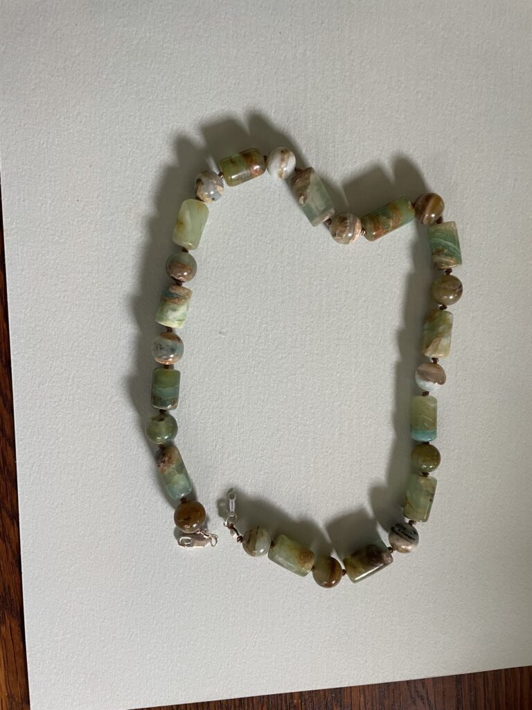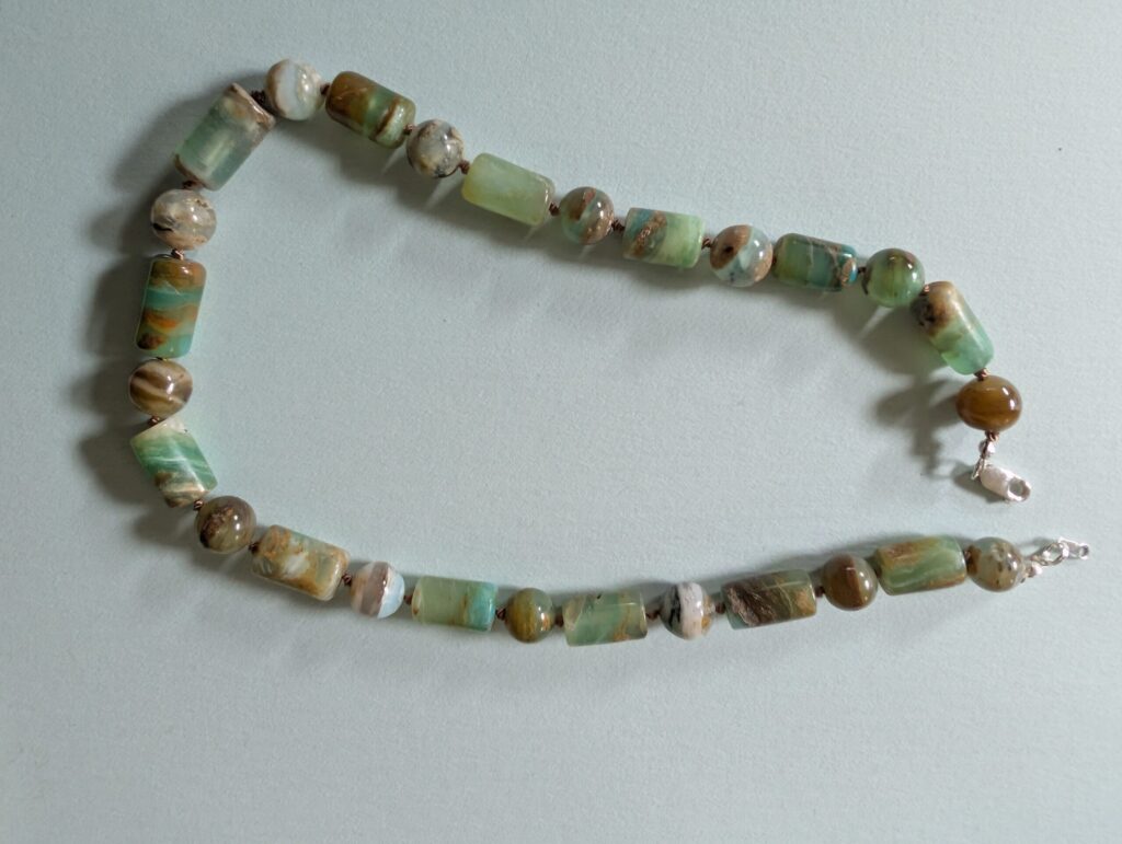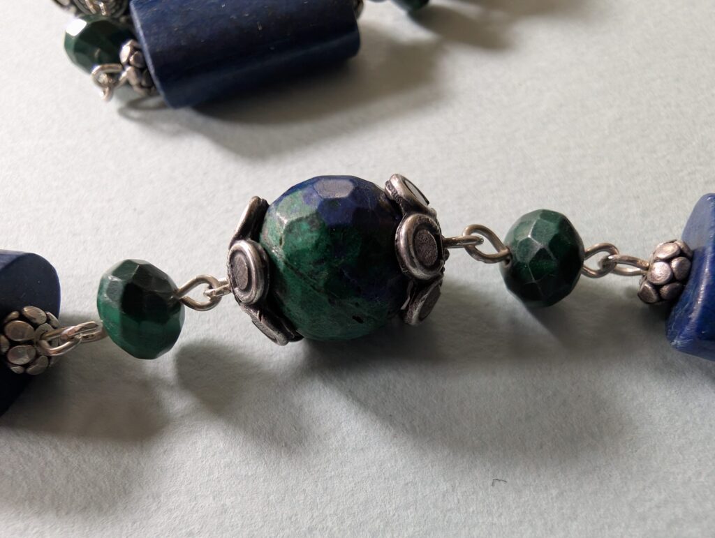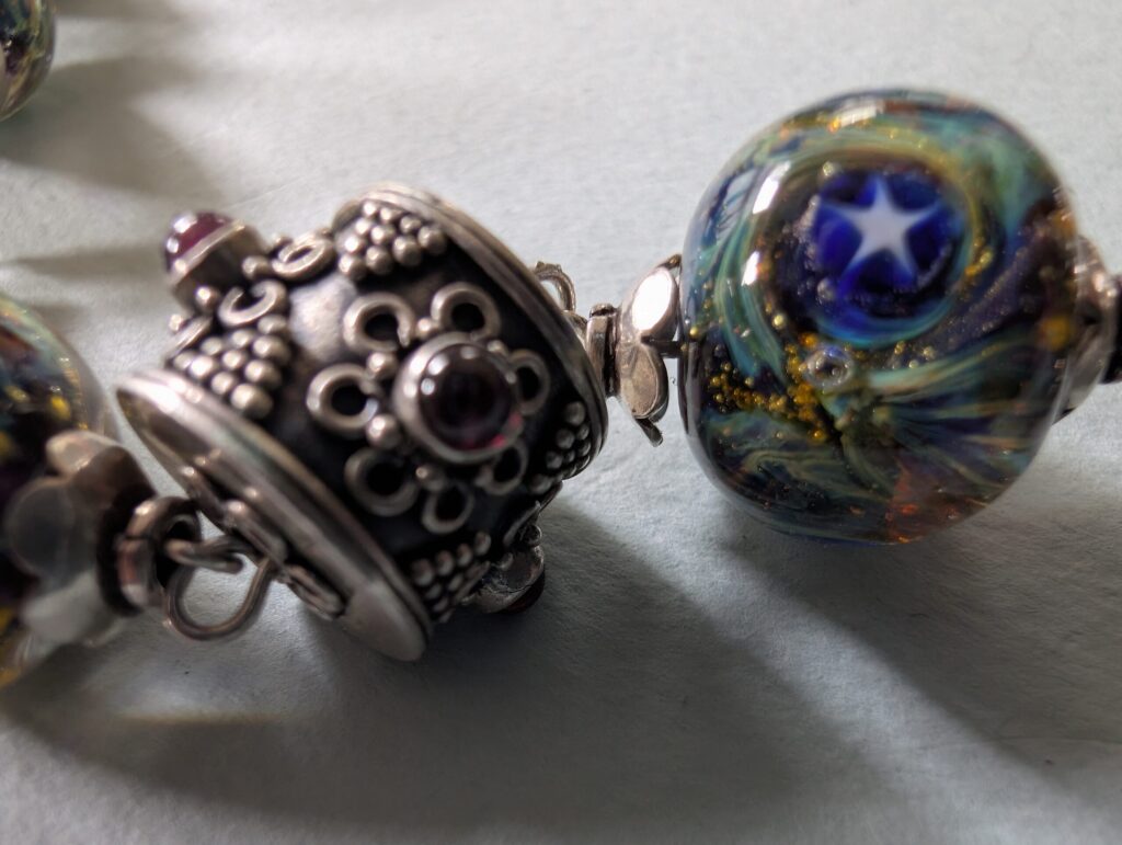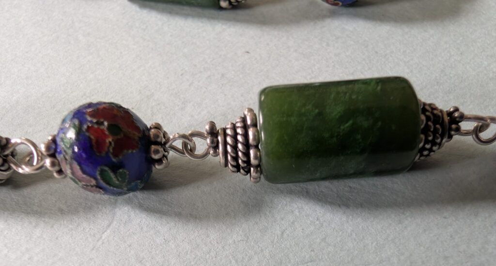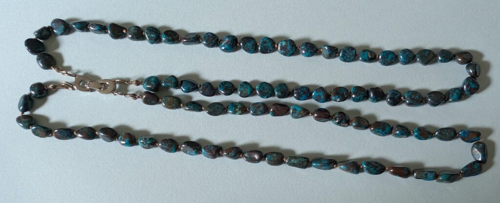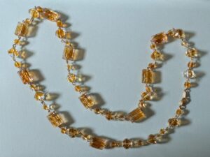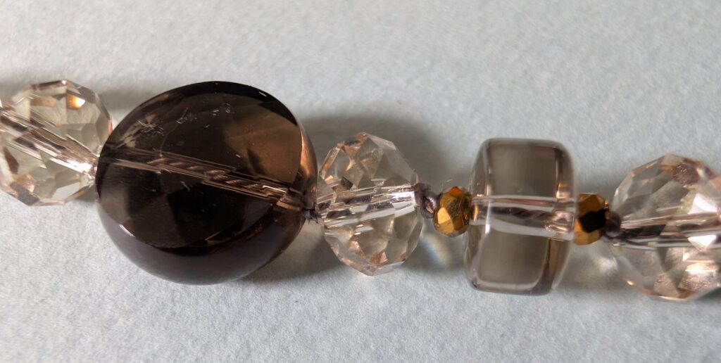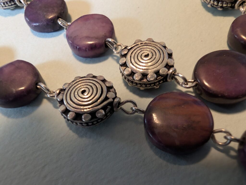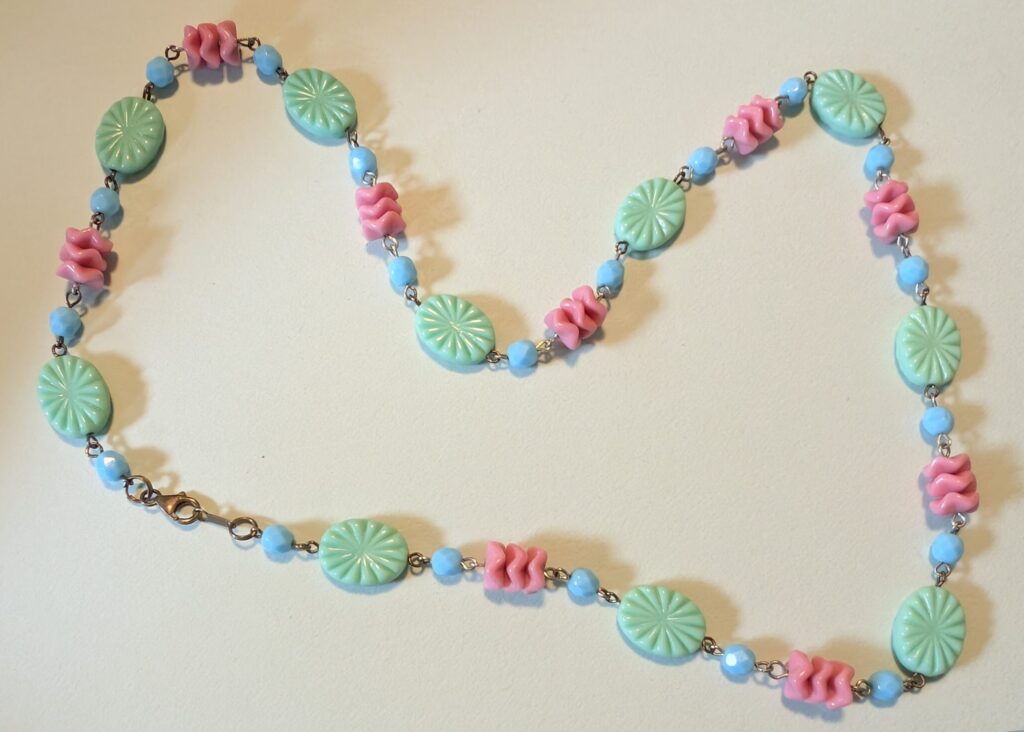 Necklaces are labeled to enable us to keep photos of the same necklace together. Numbers (e.g., “Eureka necklace 1”) have no significance other than the order in which we numbered them — that is, the numbers have no connection whatsoever with when they were made, type of beads, or anything else.