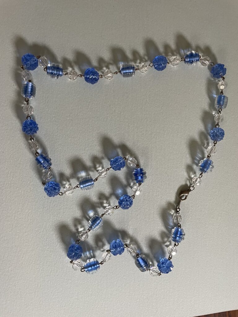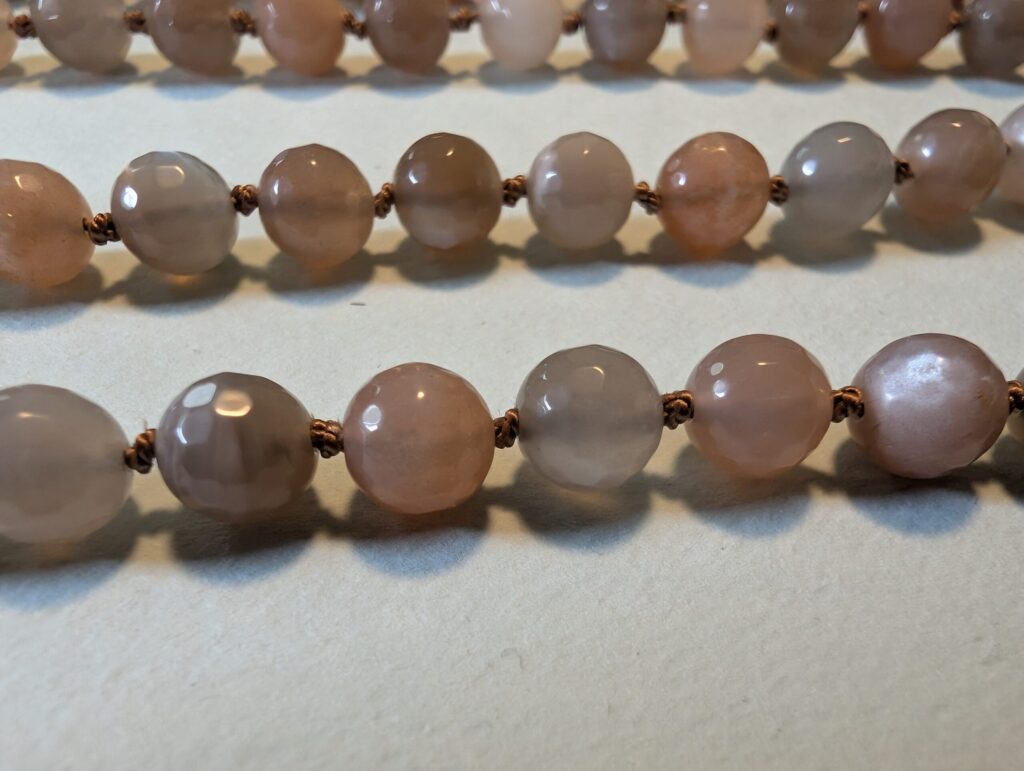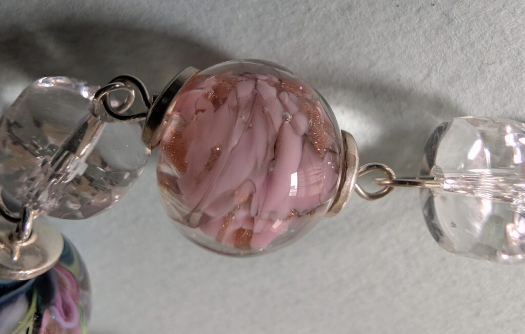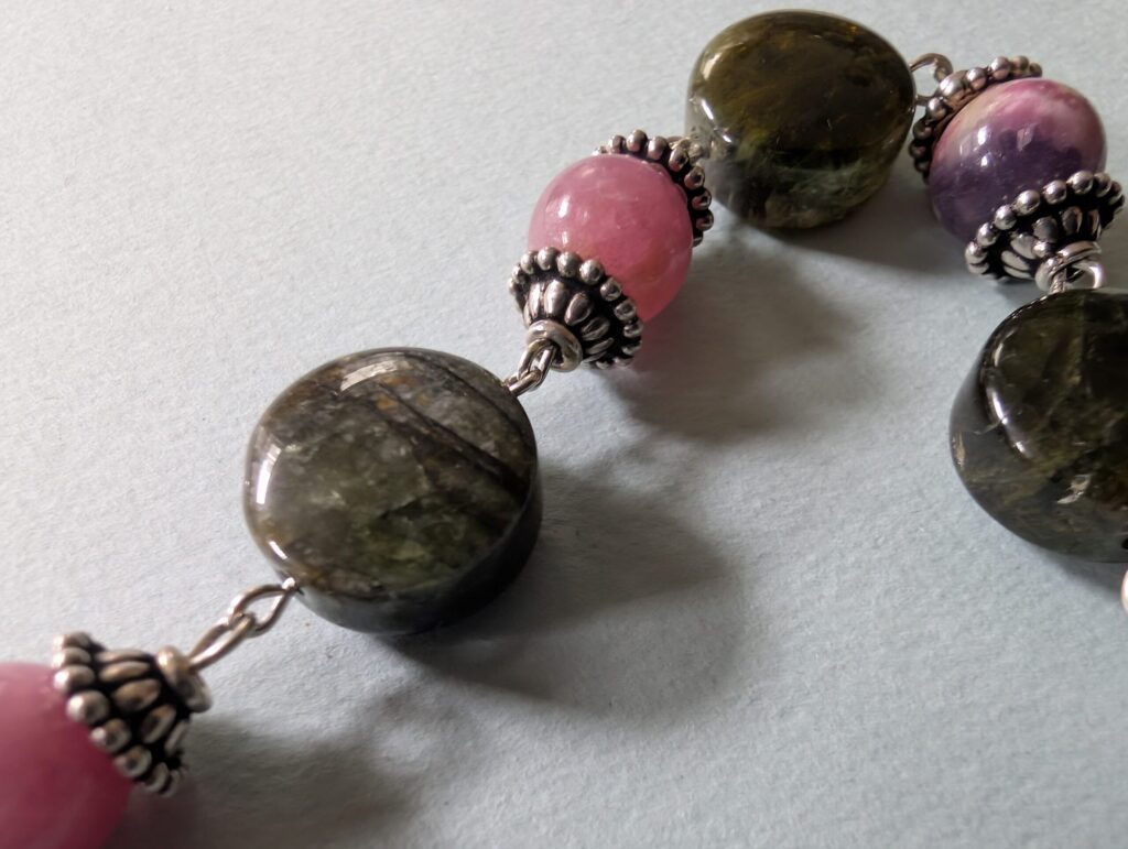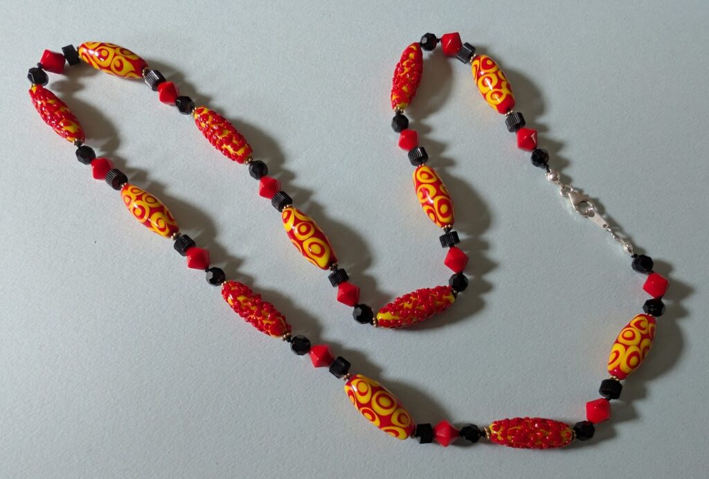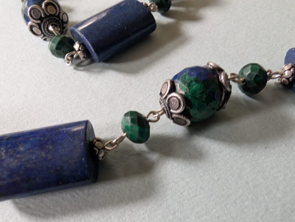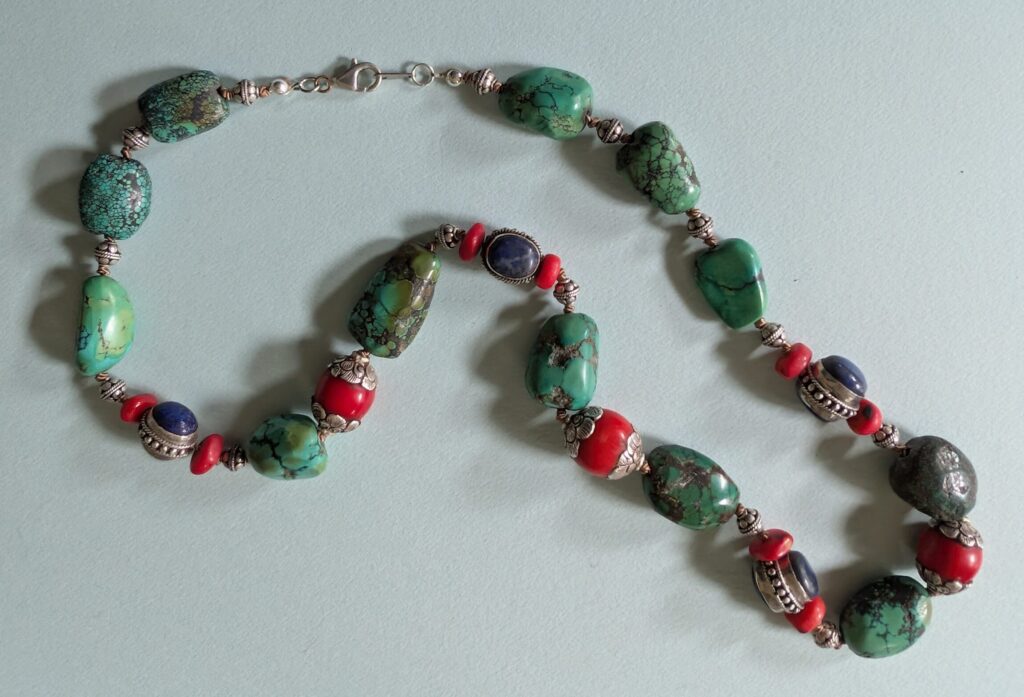 Necklaces are labeled to enable us to keep photos of the same necklace together. Numbers (e.g., “Eureka necklace 1”) have no significance other than the order in which we numbered them — that is, the numbers have no connection whatsoever with when they were made, type of beads, or anything else.