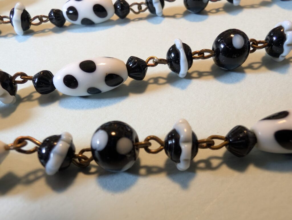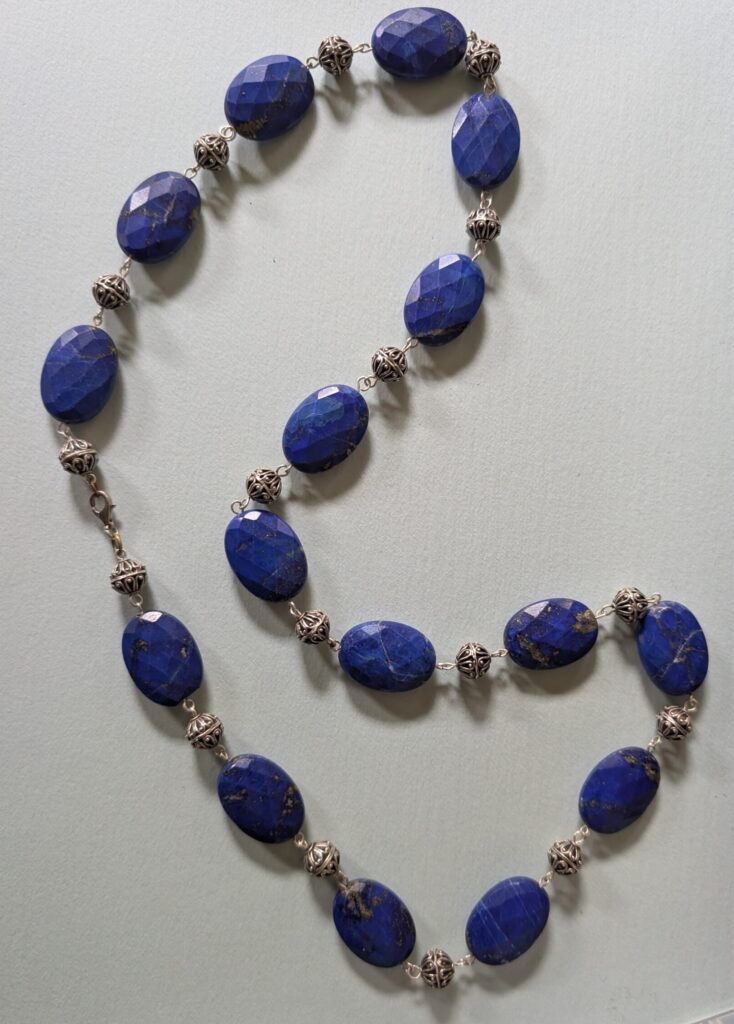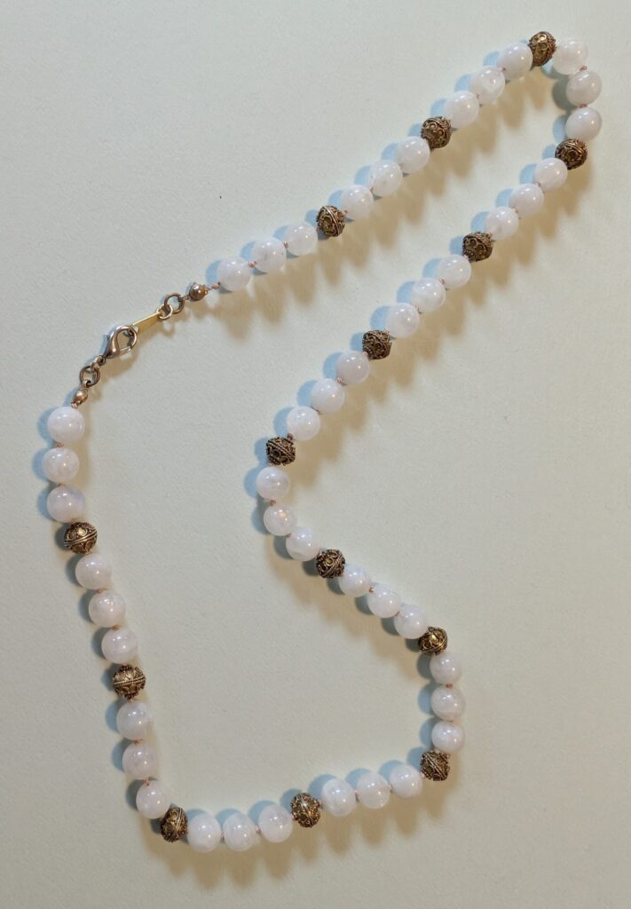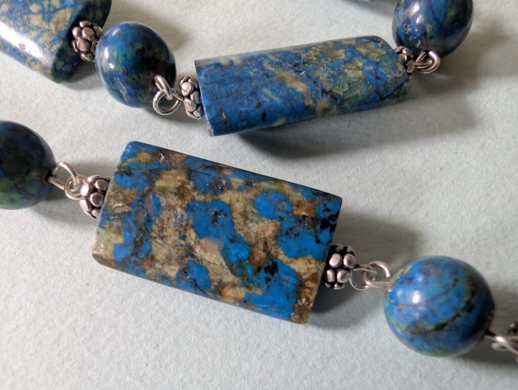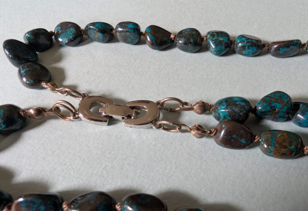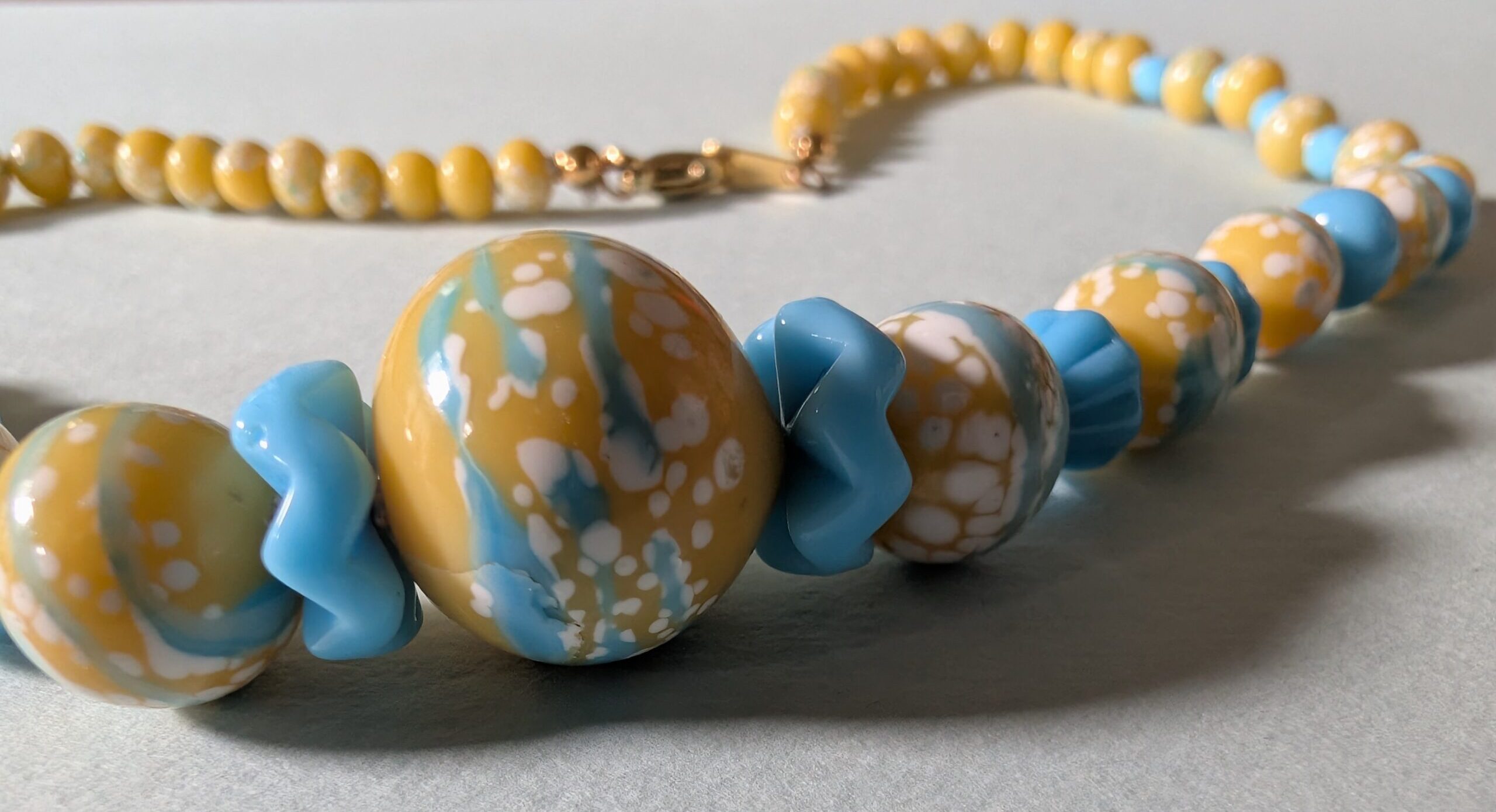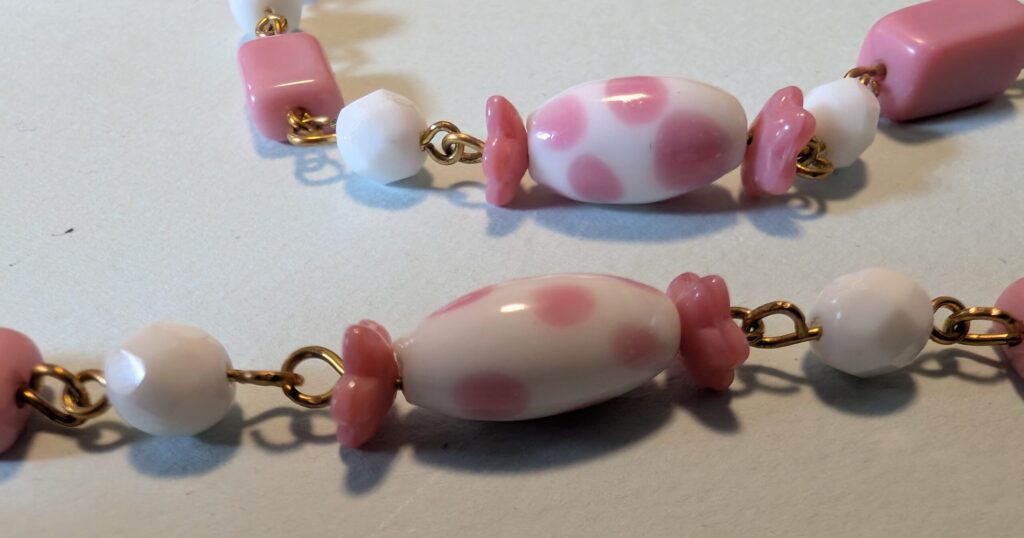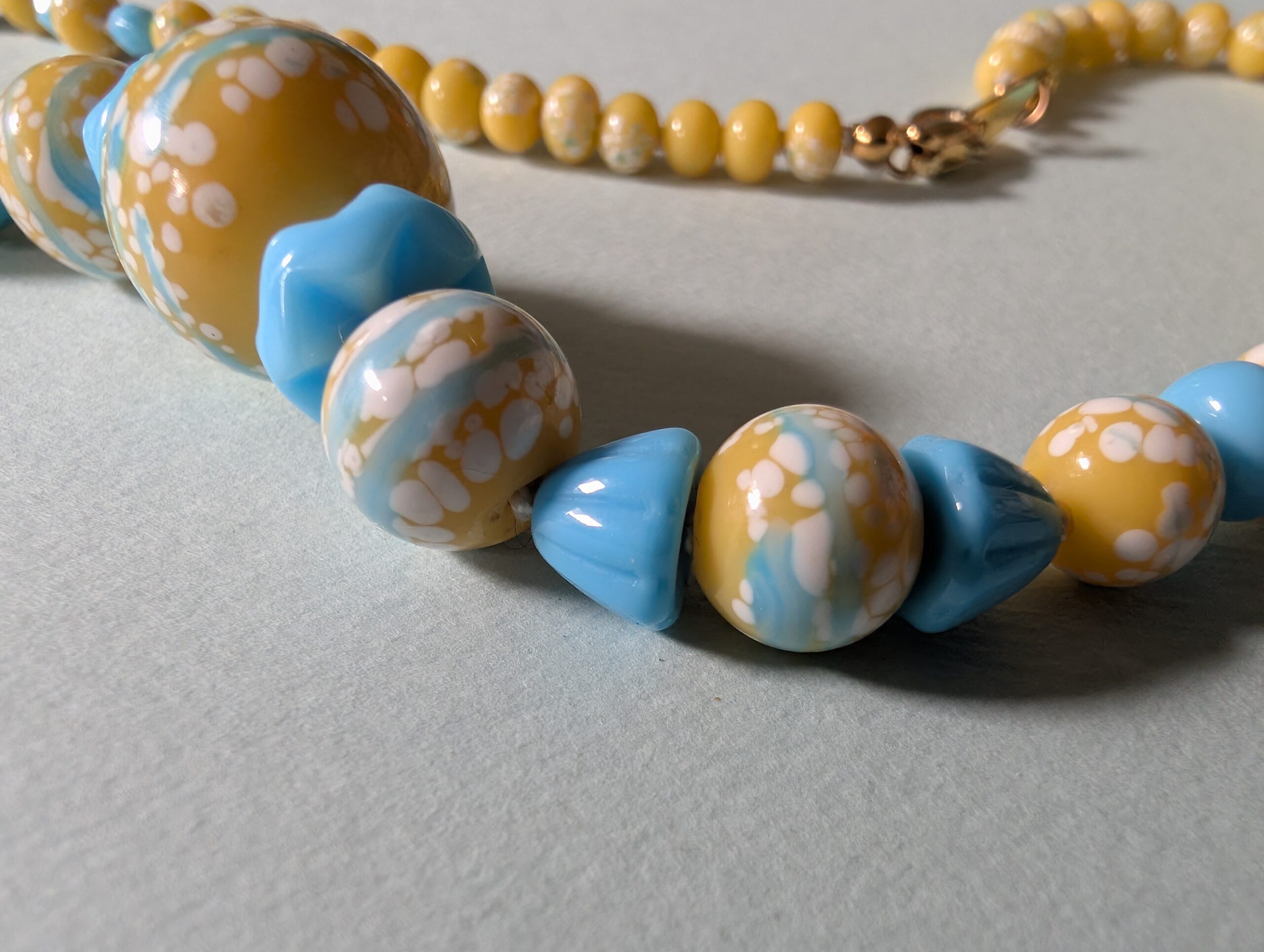 Necklaces are labeled to enable us to keep photos of the same necklace together. Numbers (e.g., “Eureka necklace 1”) have no significance other than the order in which we numbered them — that is, the numbers have no connection whatsoever with when they were made, type of beads, or anything else.