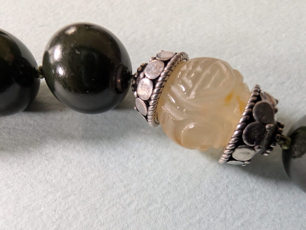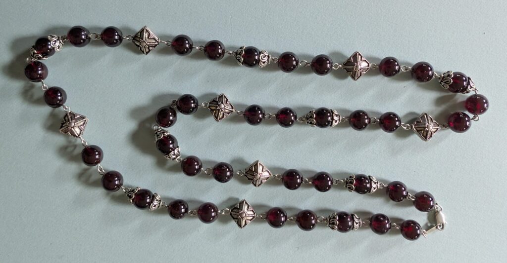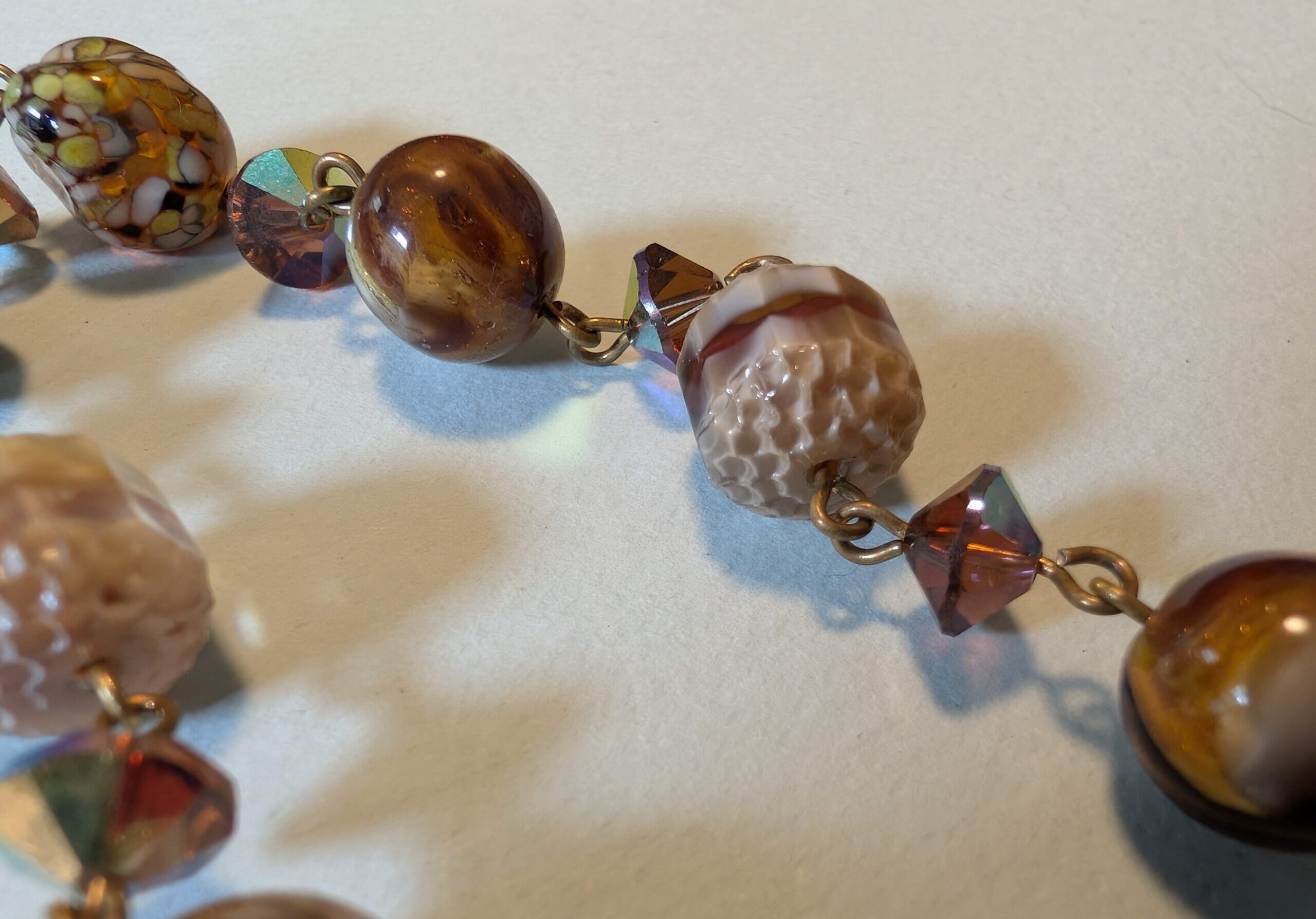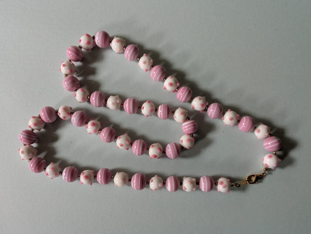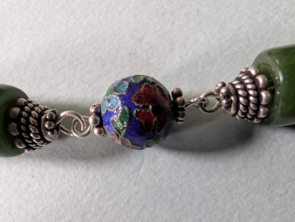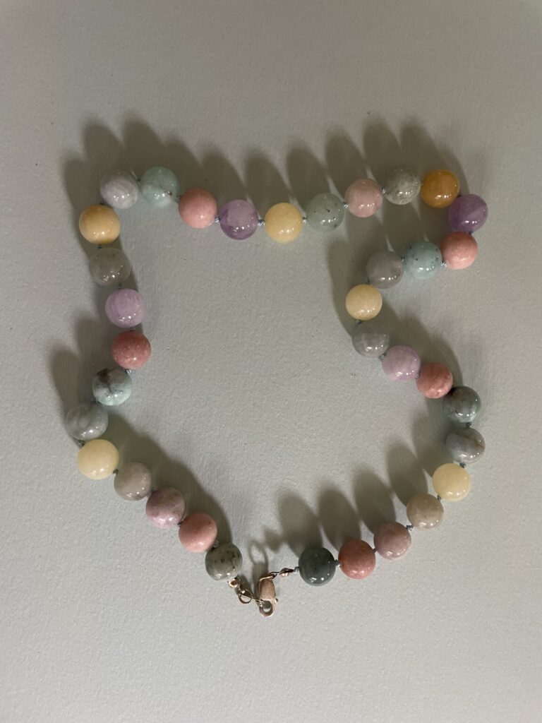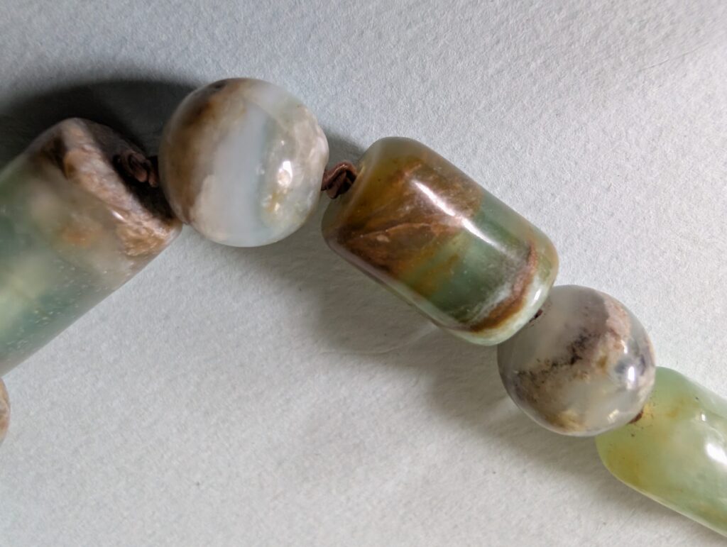 Necklaces are labeled to enable us to keep photos of the same necklace together. Numbers (e.g., “Eureka necklace 1”) have no significance other than the order in which we numbered them — that is, the numbers have no connection whatsoever with when they were made, type of beads, or anything else.