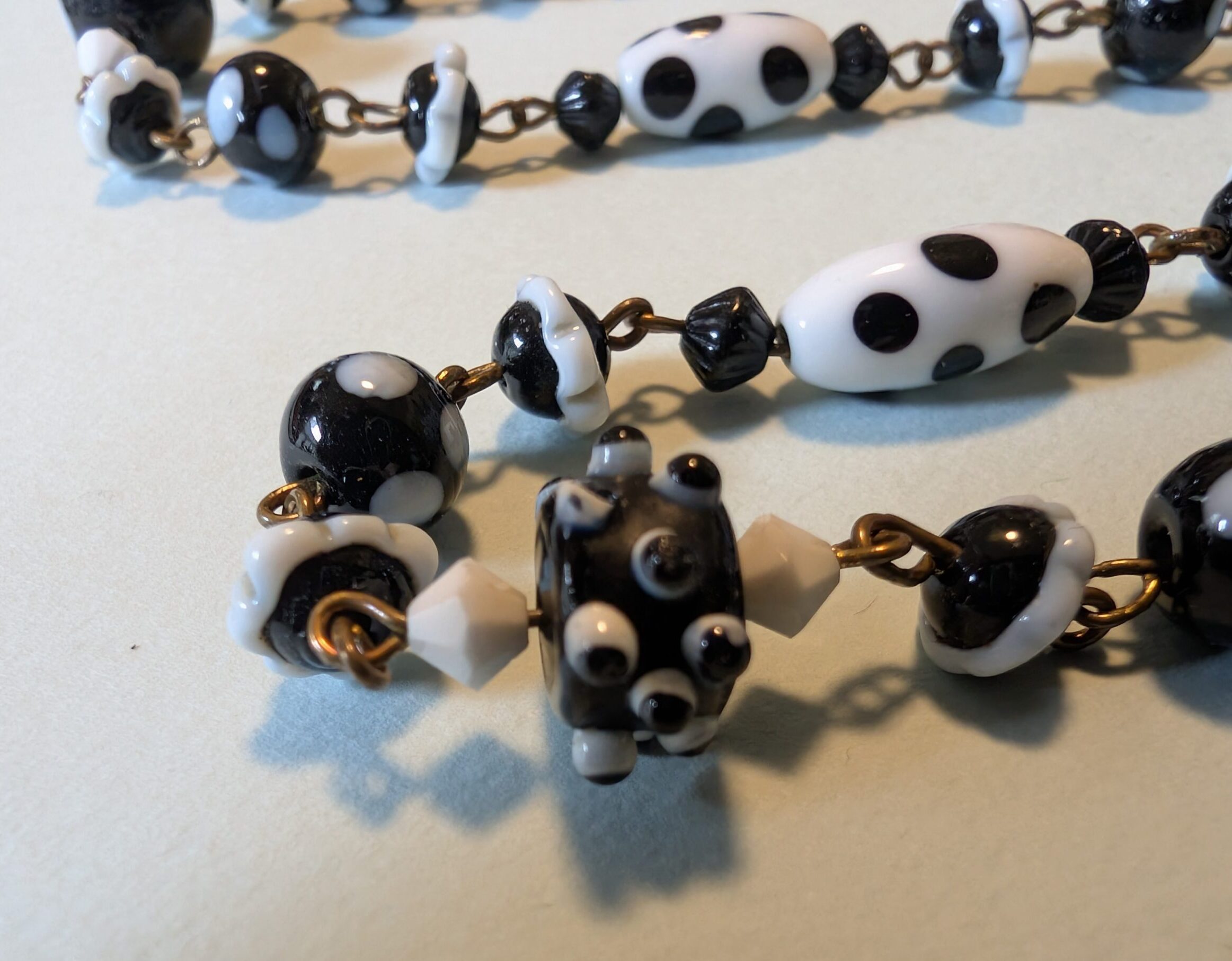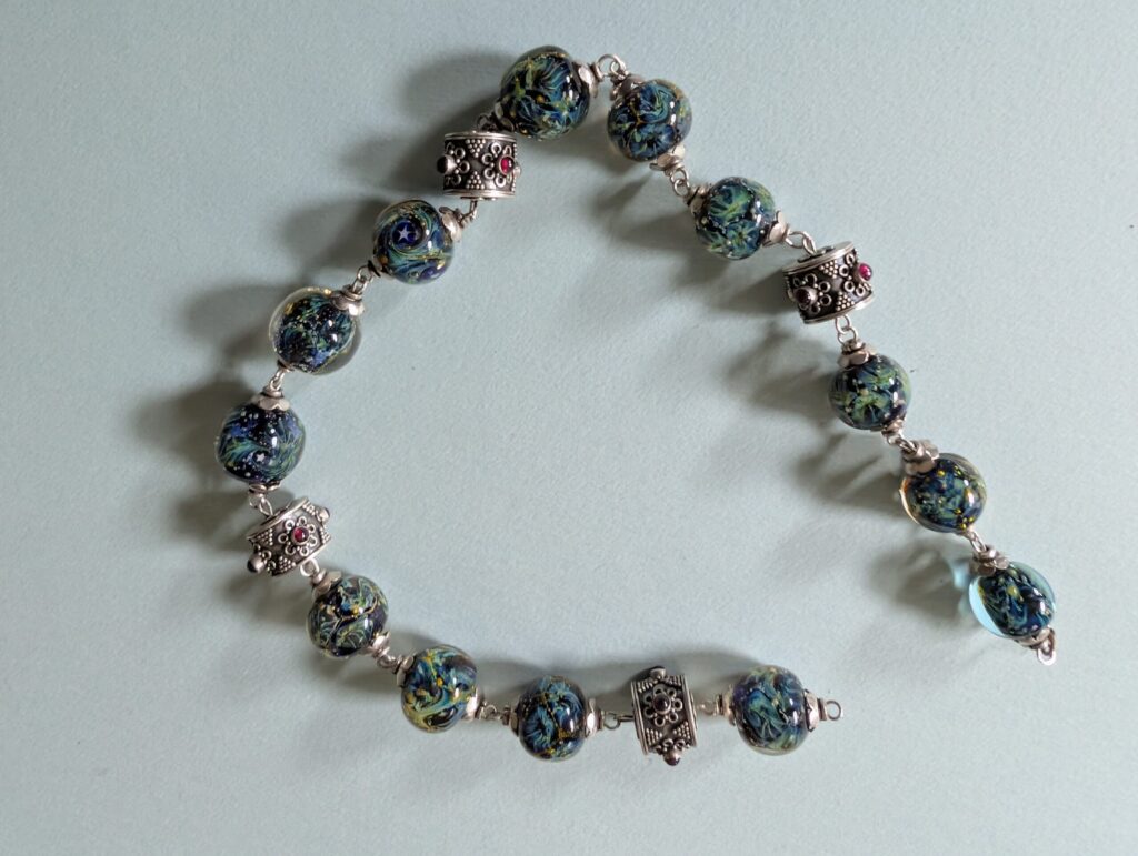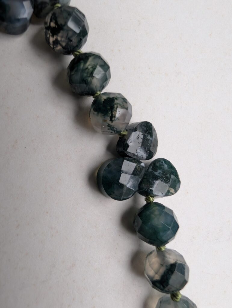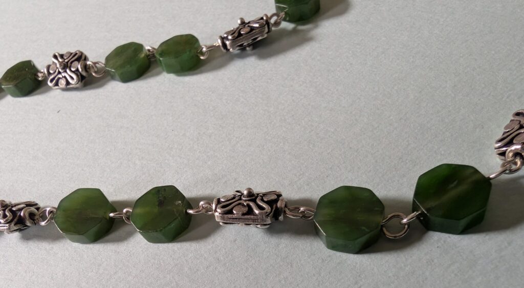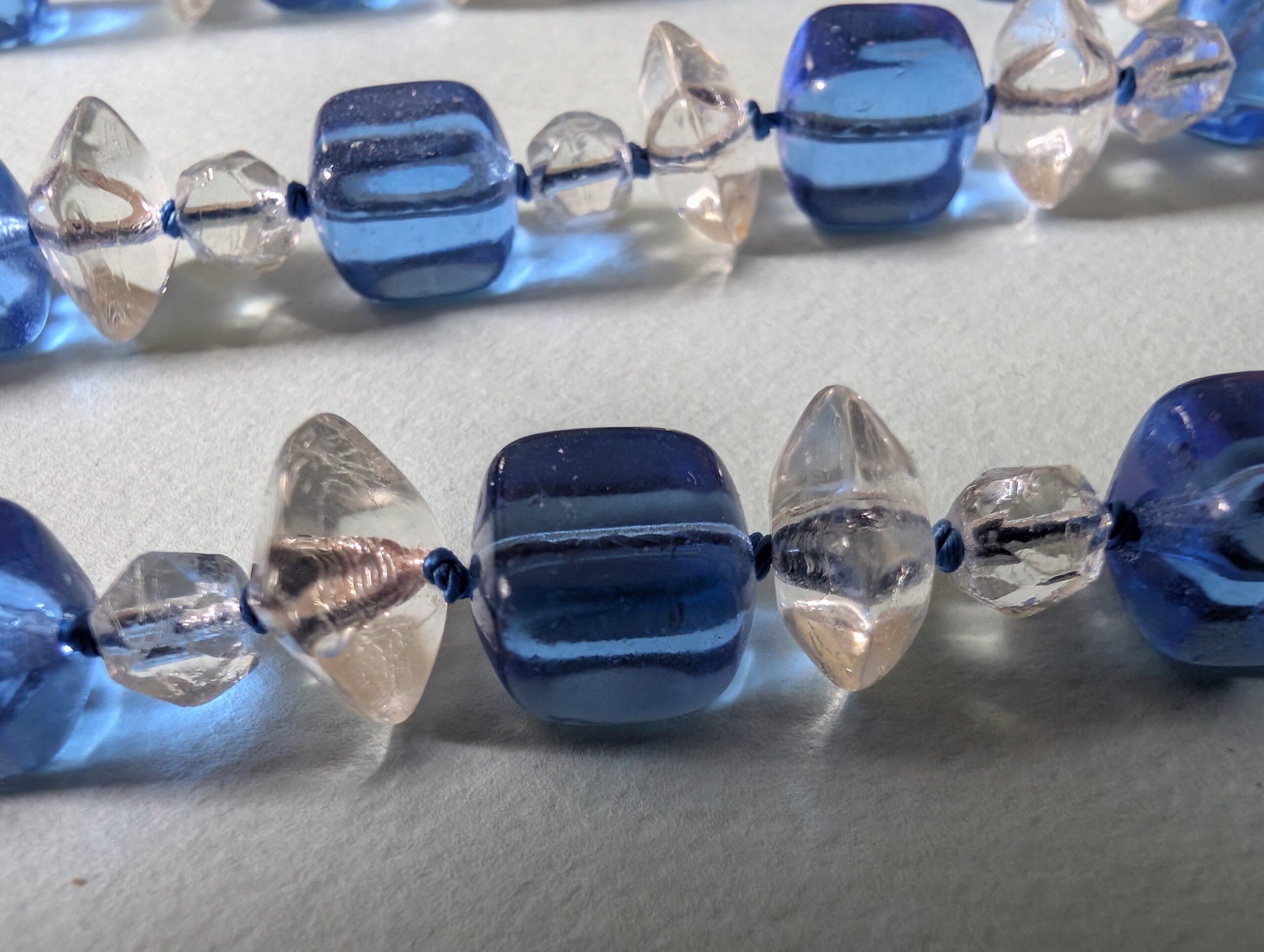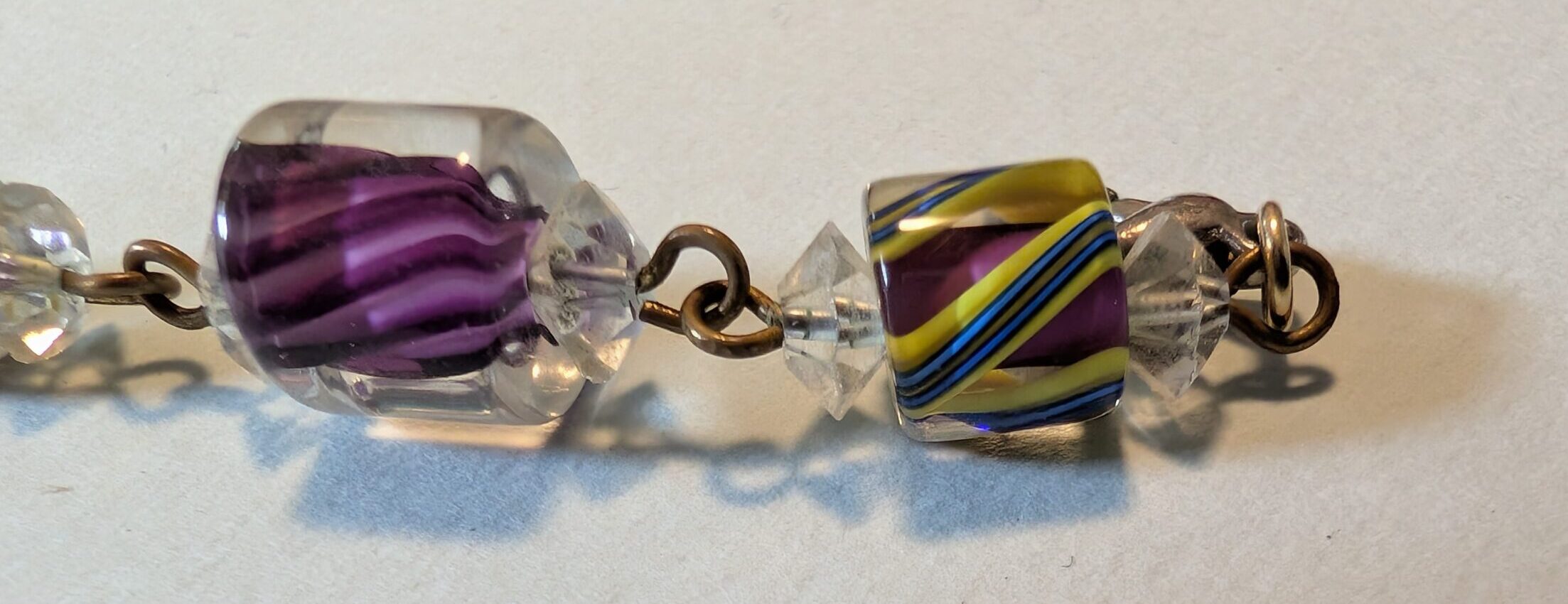 Necklaces are labeled to enable us to keep photos of the same necklace together. Numbers (e.g., “Eureka necklace 1”) have no significance other than the order in which we numbered them — that is, the numbers have no connection whatsoever with when they were made, type of beads, or anything else.