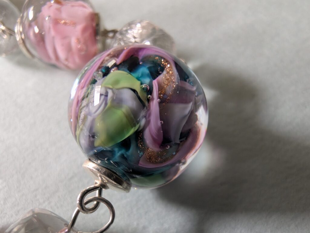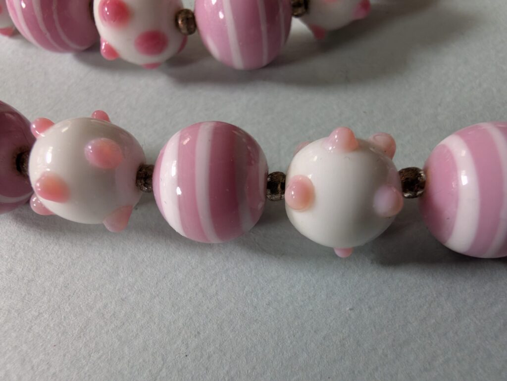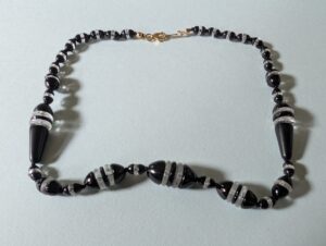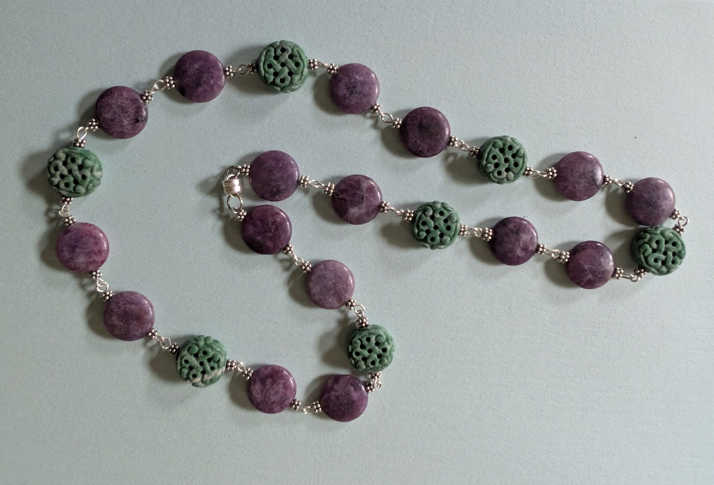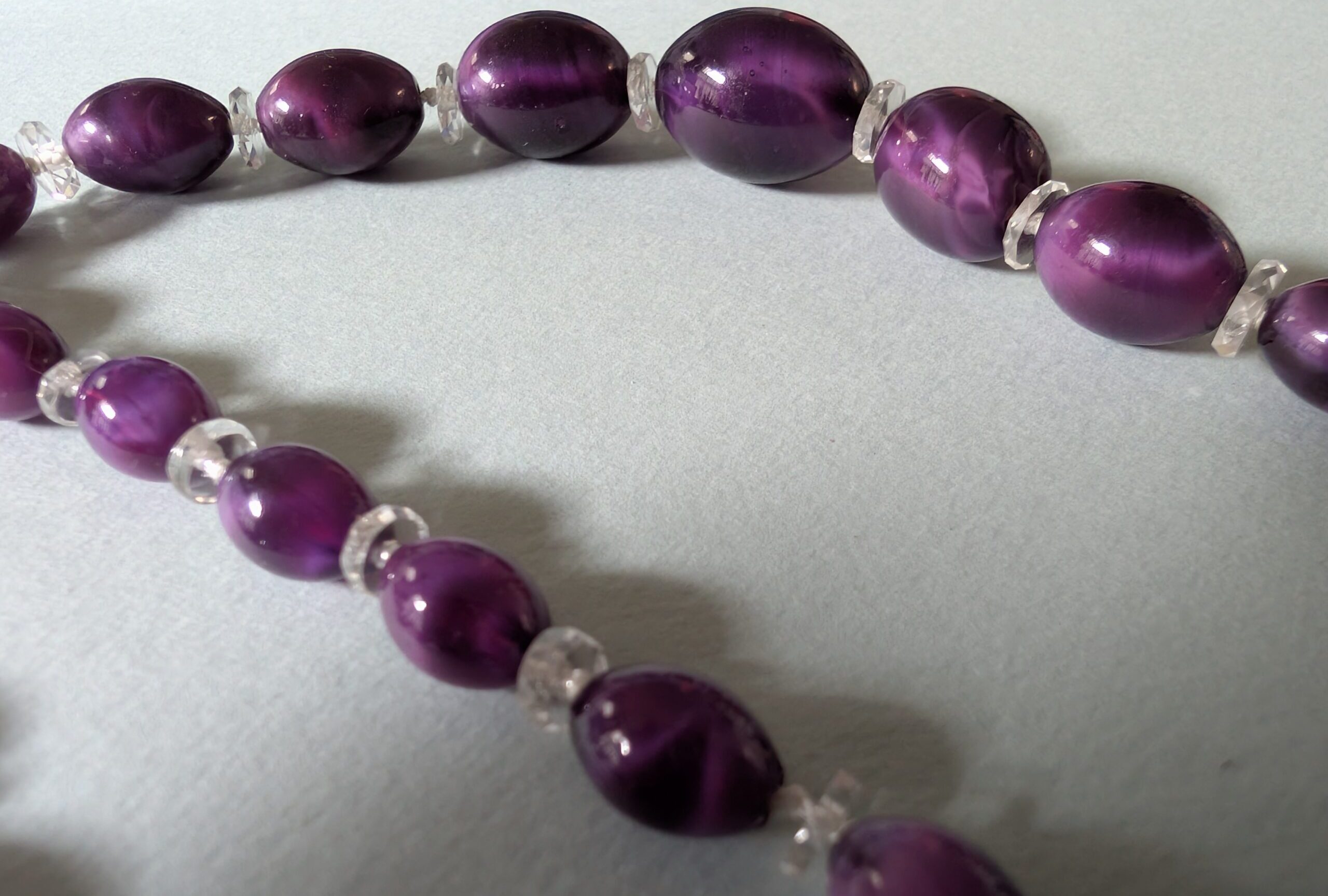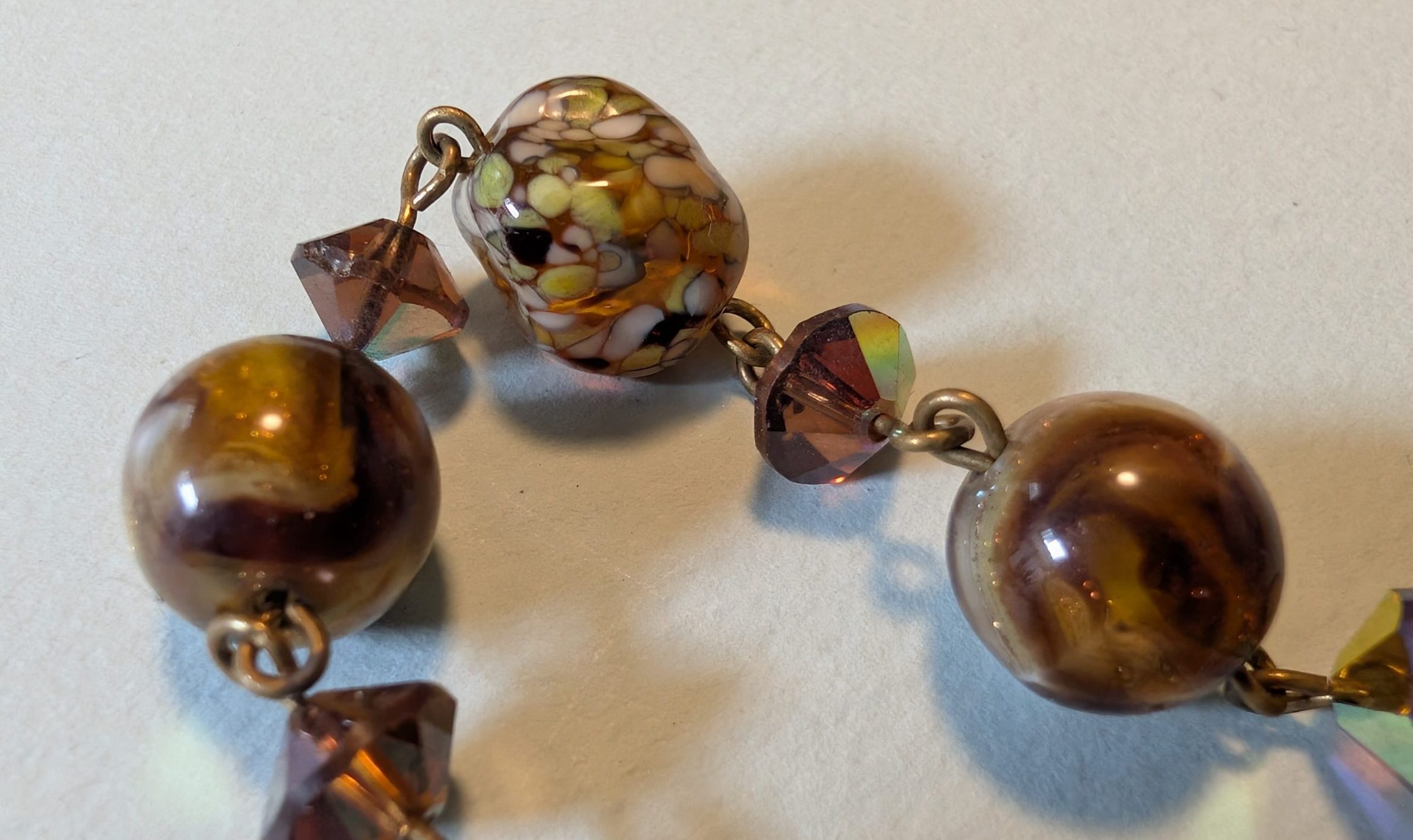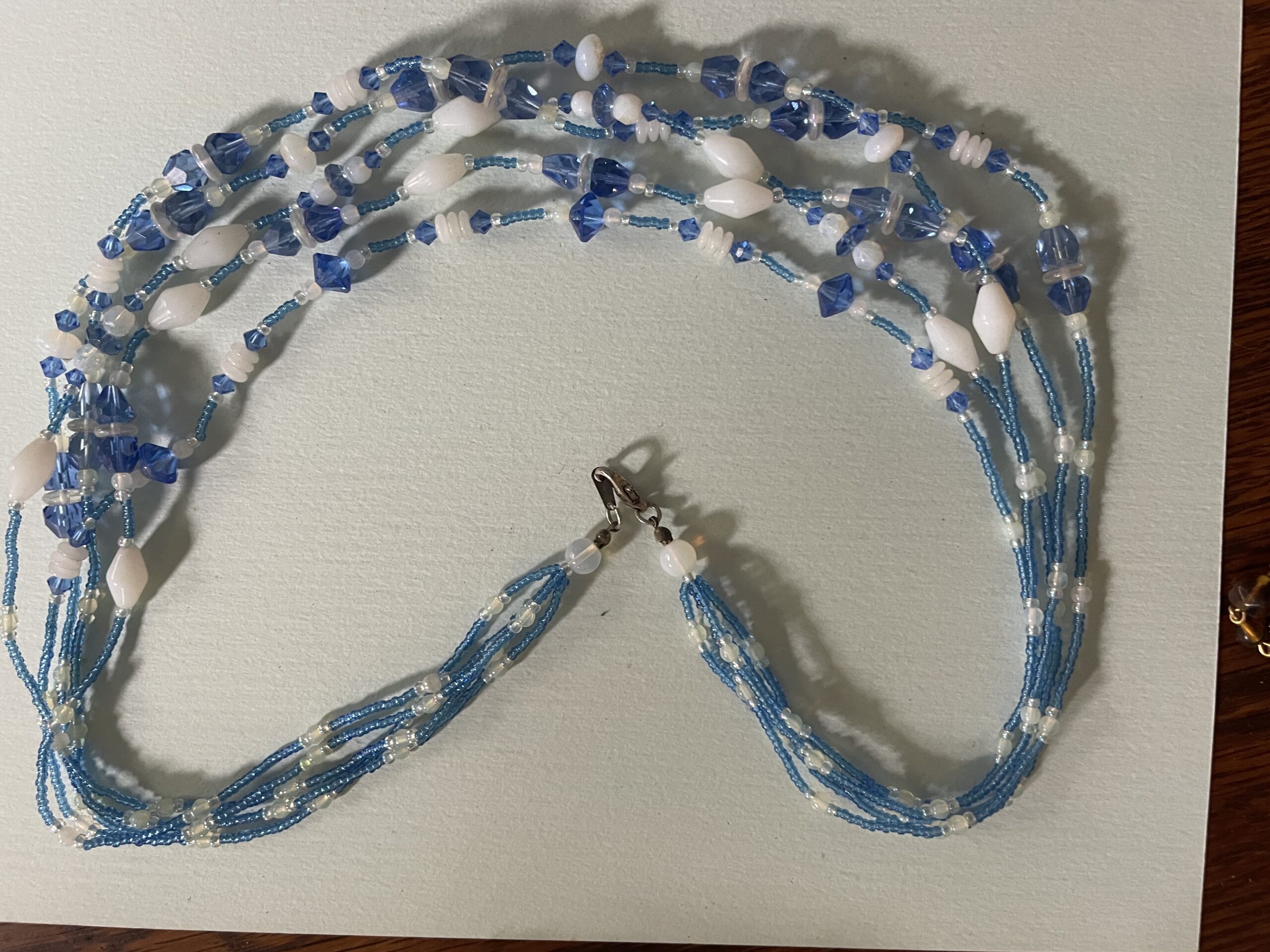 Necklaces are labeled to enable us to keep photos of the same necklace together. Numbers (e.g., “Eureka necklace 1”) have no significance other than the order in which we numbered them — that is, the numbers have no connection whatsoever with when they were made, type of beads, or anything else.