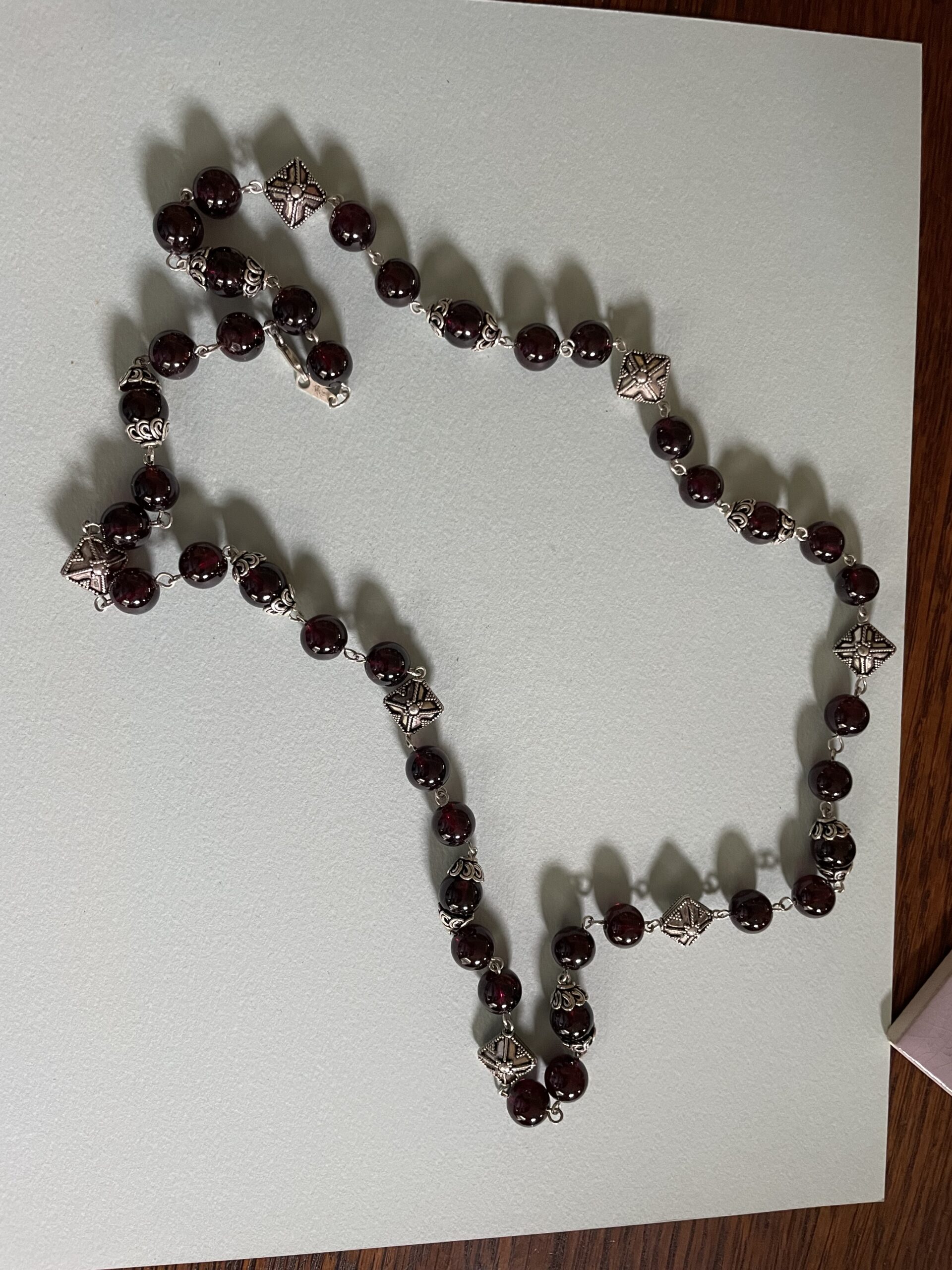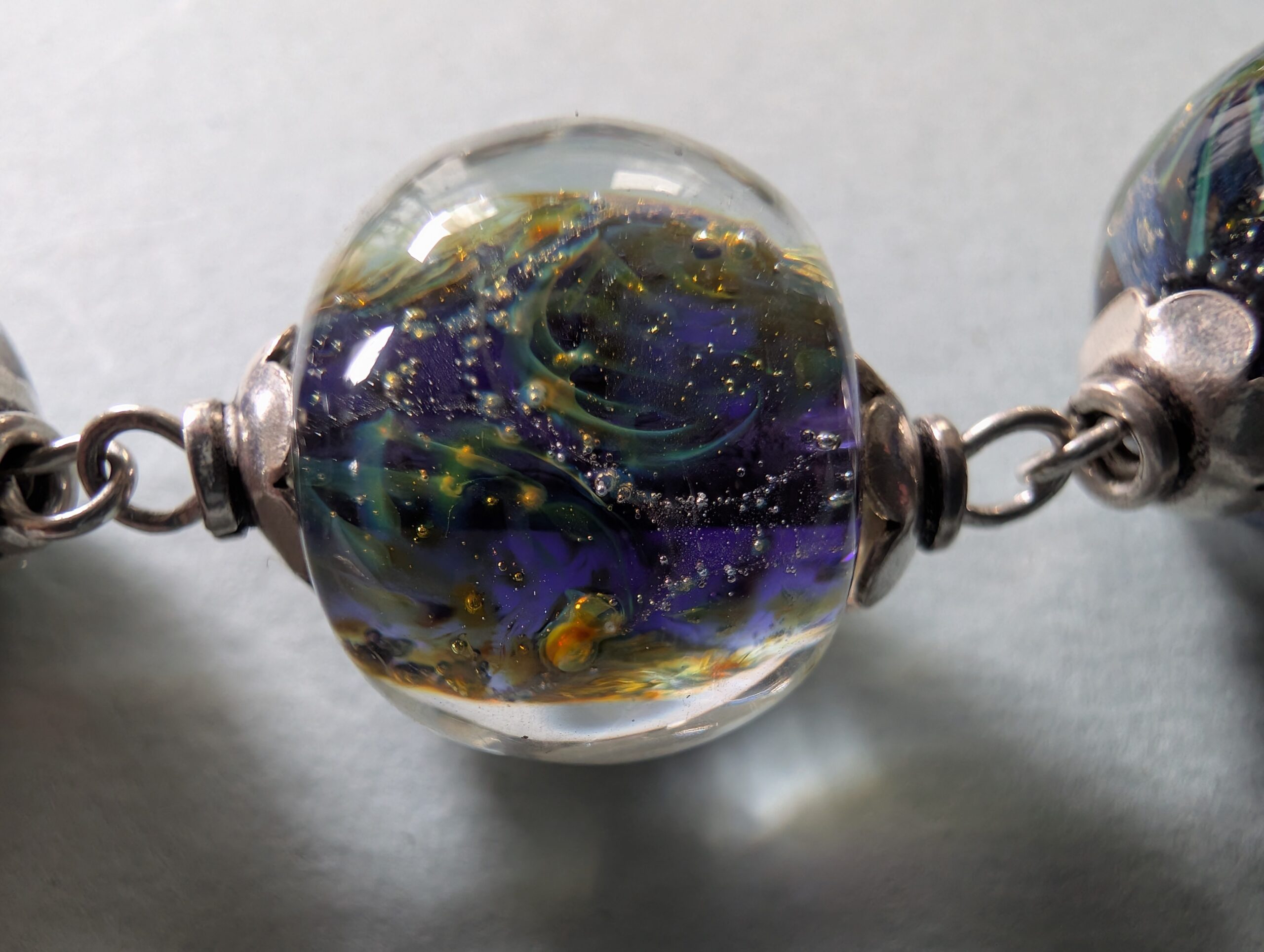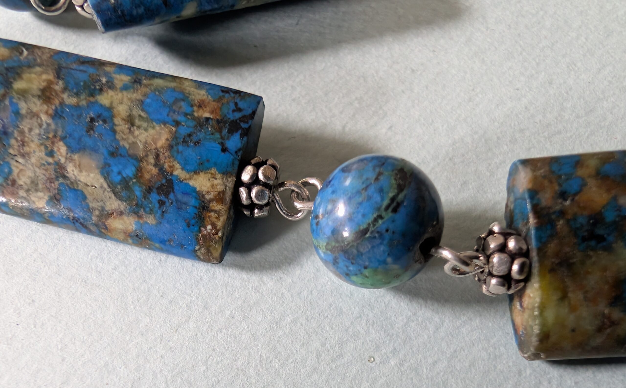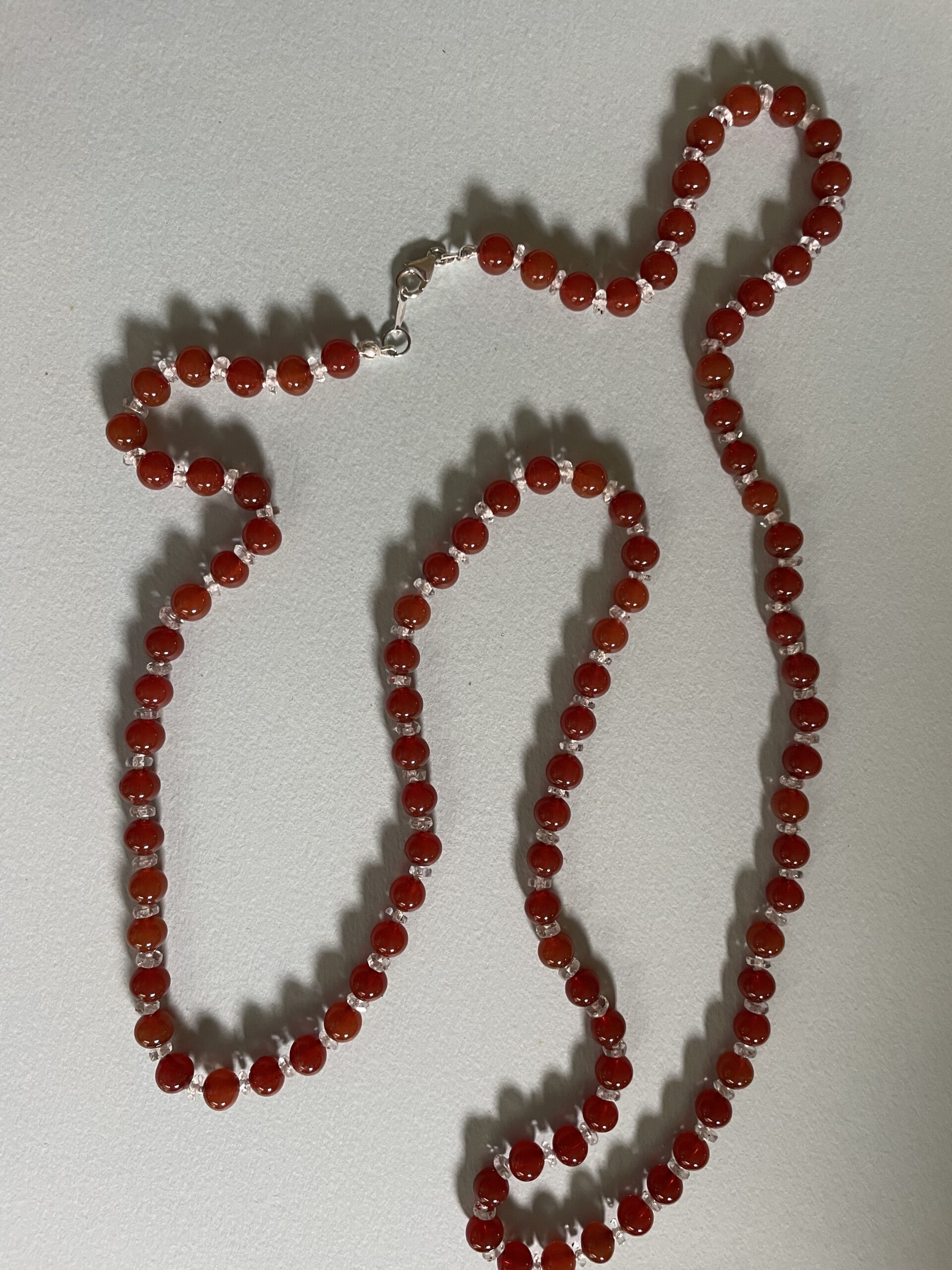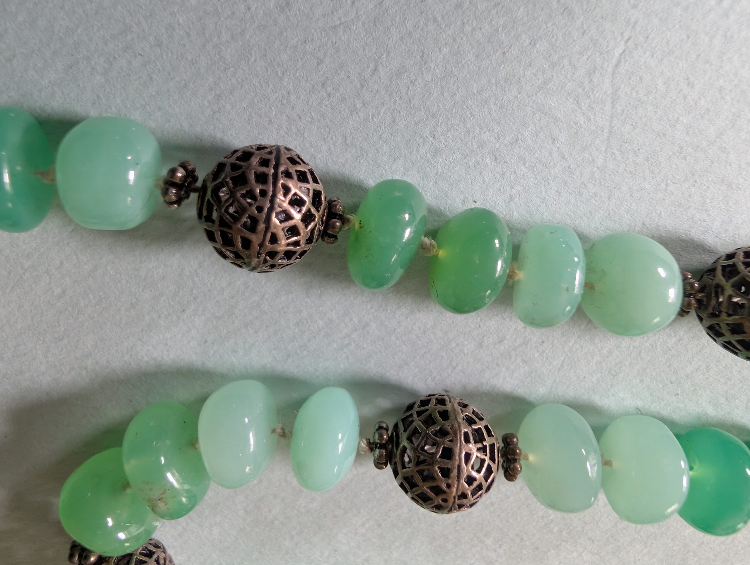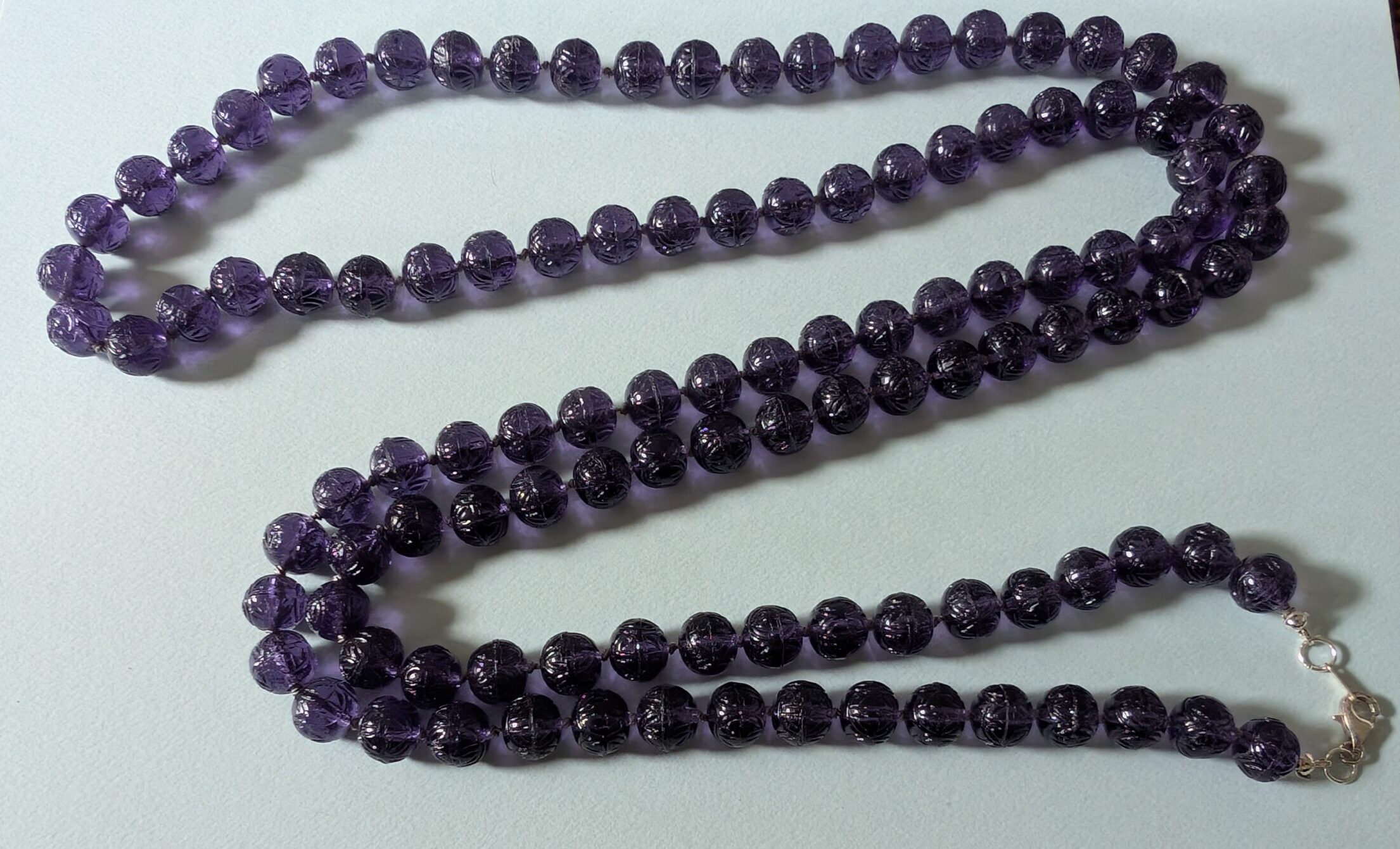 Necklaces are labeled to enable us to keep photos of the same necklace together. Numbers (e.g., “Eureka necklace 1”) have no significance other than the order in which we numbered them — that is, the numbers have no connection whatsoever with when they were made, type of beads, or anything else.