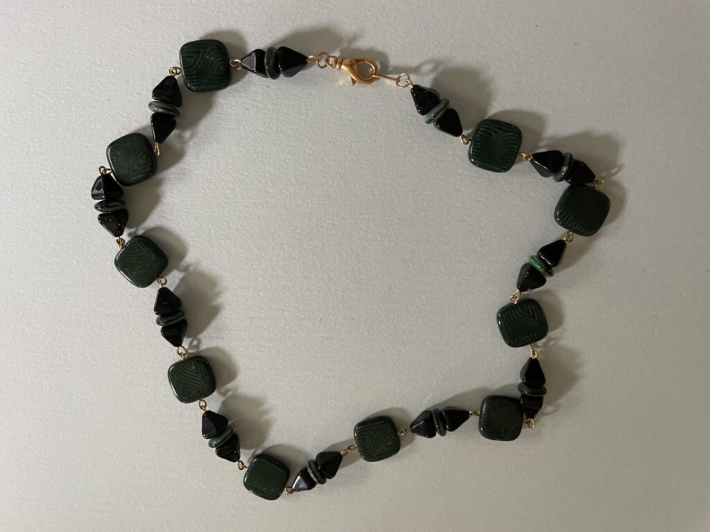 While Freddie was best-known for her widely-published collages, she was also known among her friends for her love of beading and making jewelry. Like her collage, she basically gave away her jewelry, either to friends or as donations for benefit auctions. She would thrift for beads, looking in particular for stone and vintage glass beads. “Isn’t that just fabulous?” she would say of some stunning, unusual vintage find.