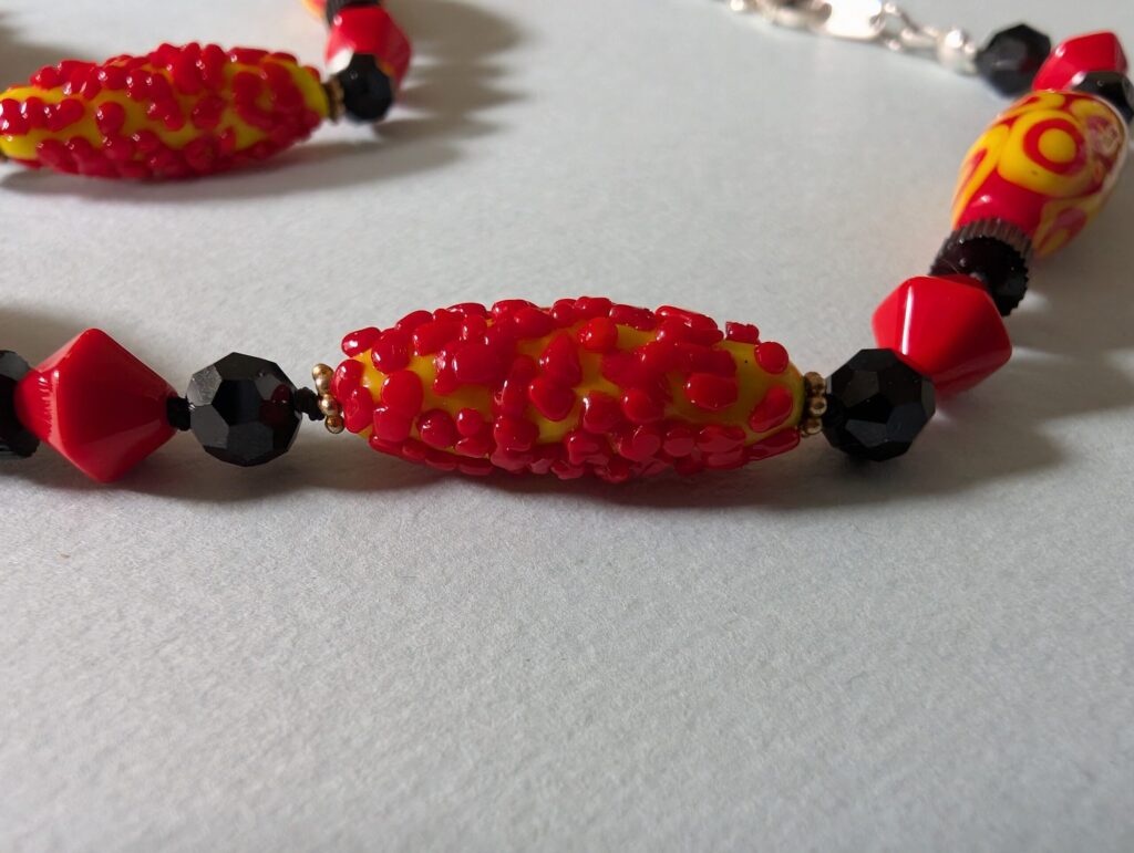 “A Drop of Raspberry” was based on A Drop of Raspberry by Csilla Kleinheincz, donated by Freddie to benefit the Interstitial Arts Foundation, at IAFauctions. The necklace is described on Flickr as: