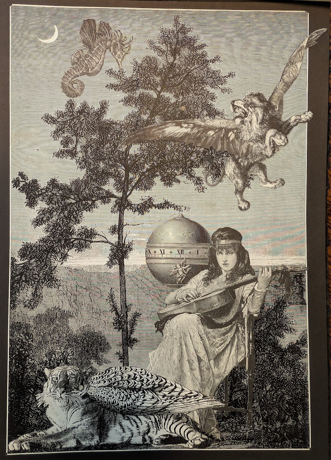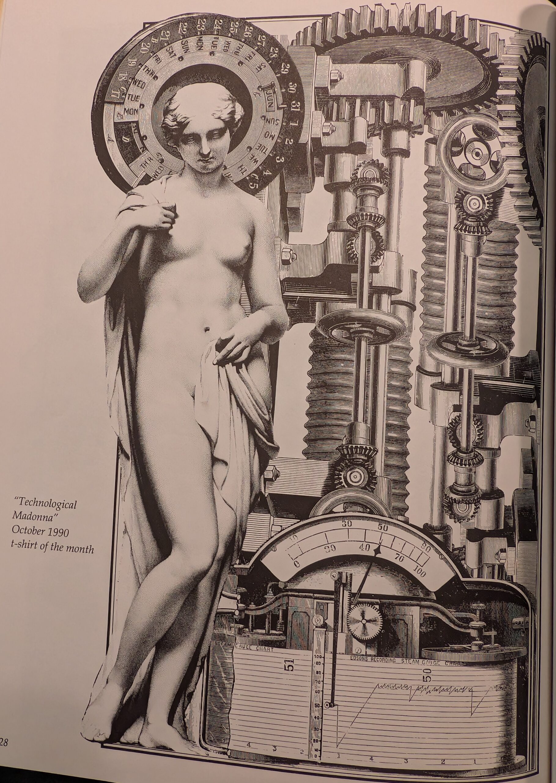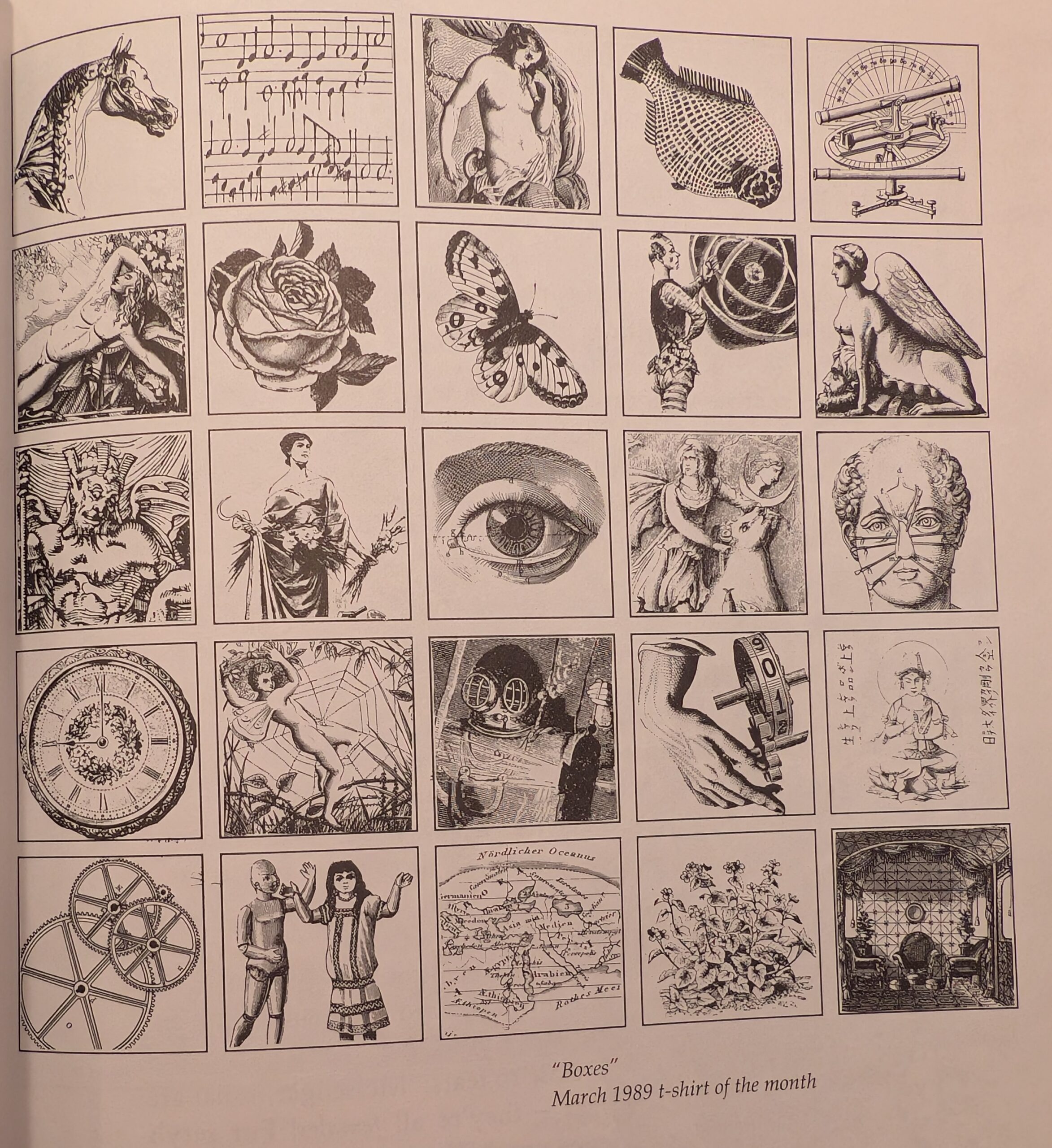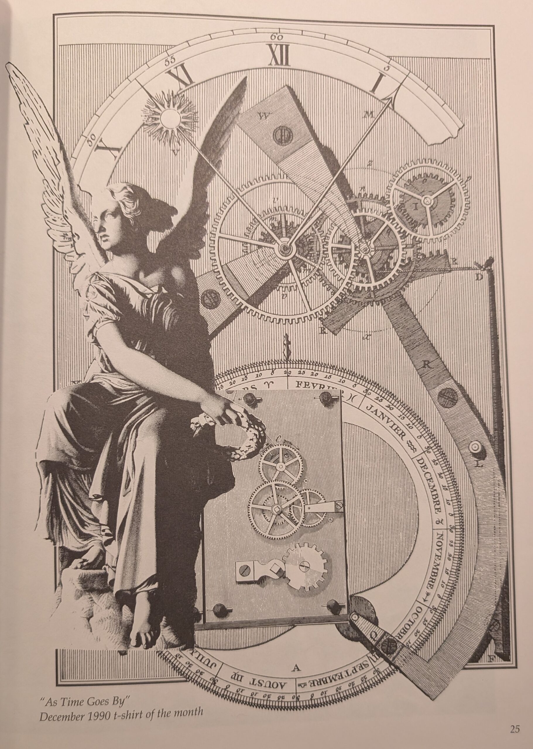 1990, “Music Has Charms ….” August 1990 t-shirt of the month. Collage, included in Ecstatic Incisions p.31