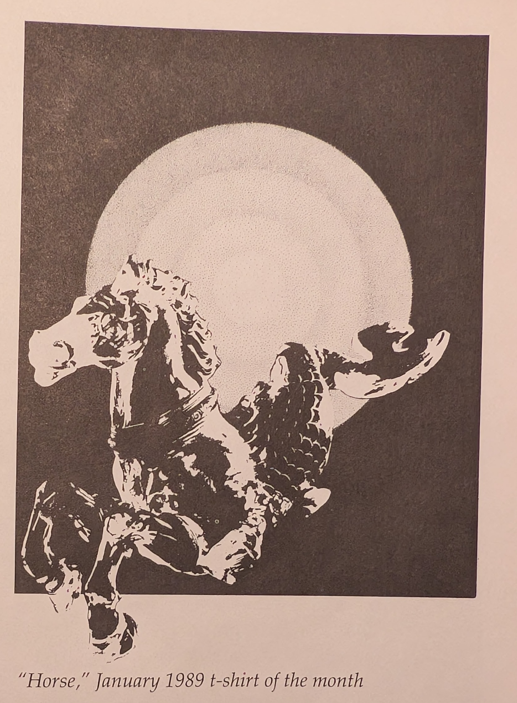 1991. “Our Lady of the Flayed Stallion”, February 1991 t-shirt of the month. (Included in Ecstatic Incisions, p.24)