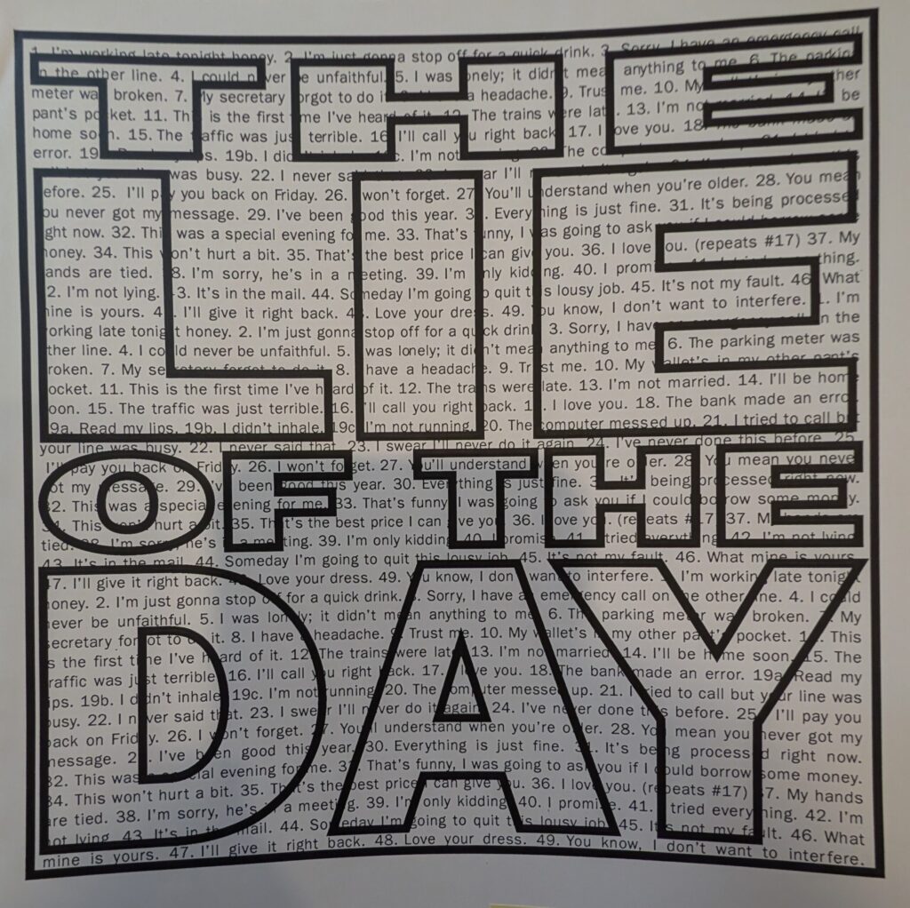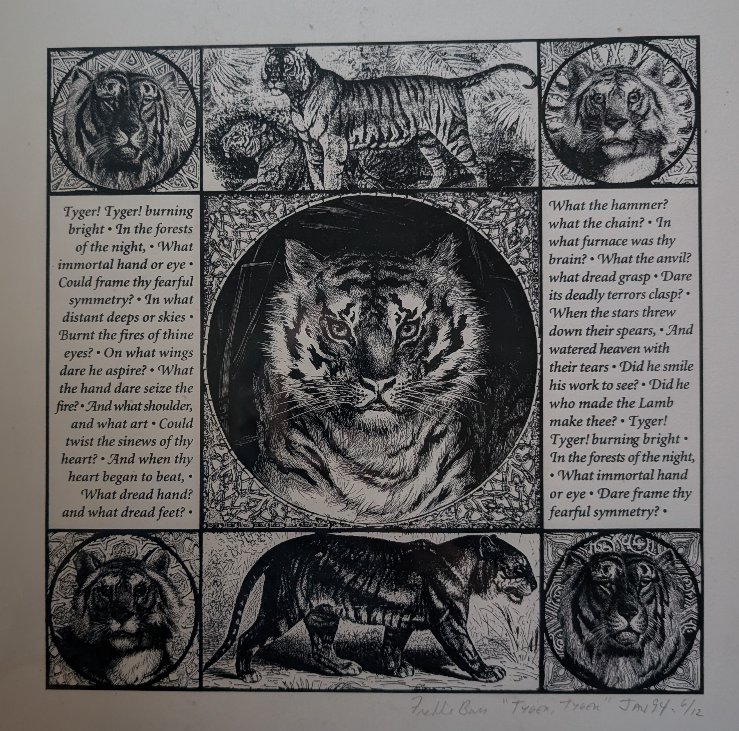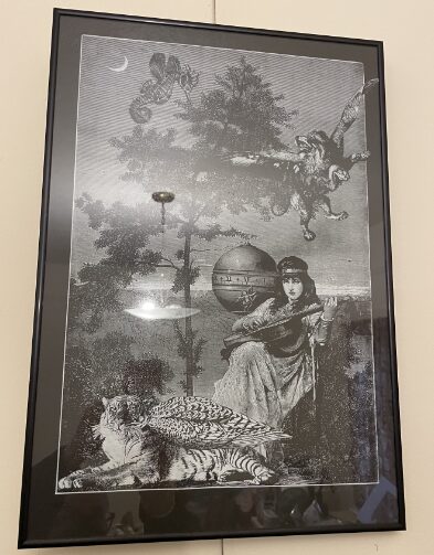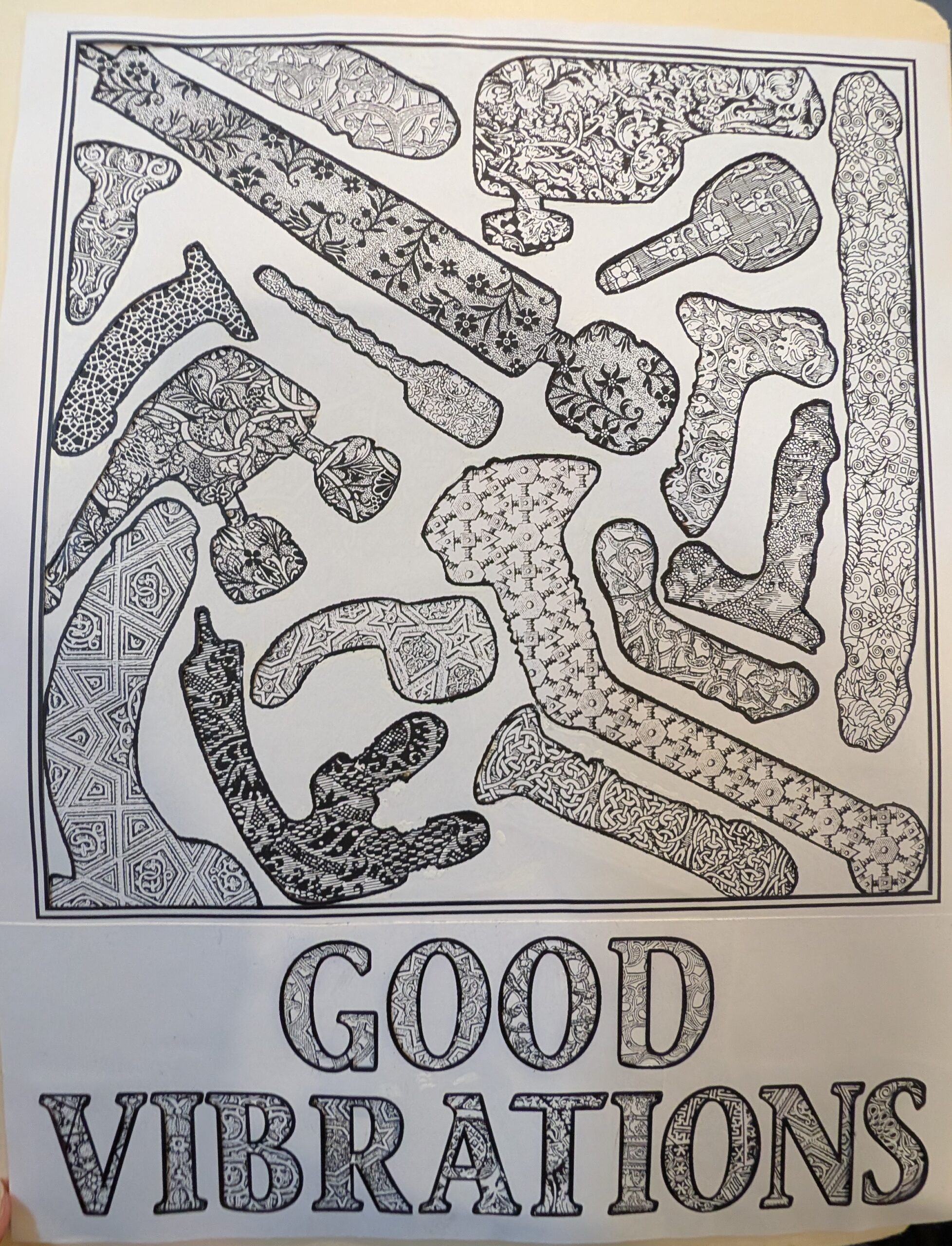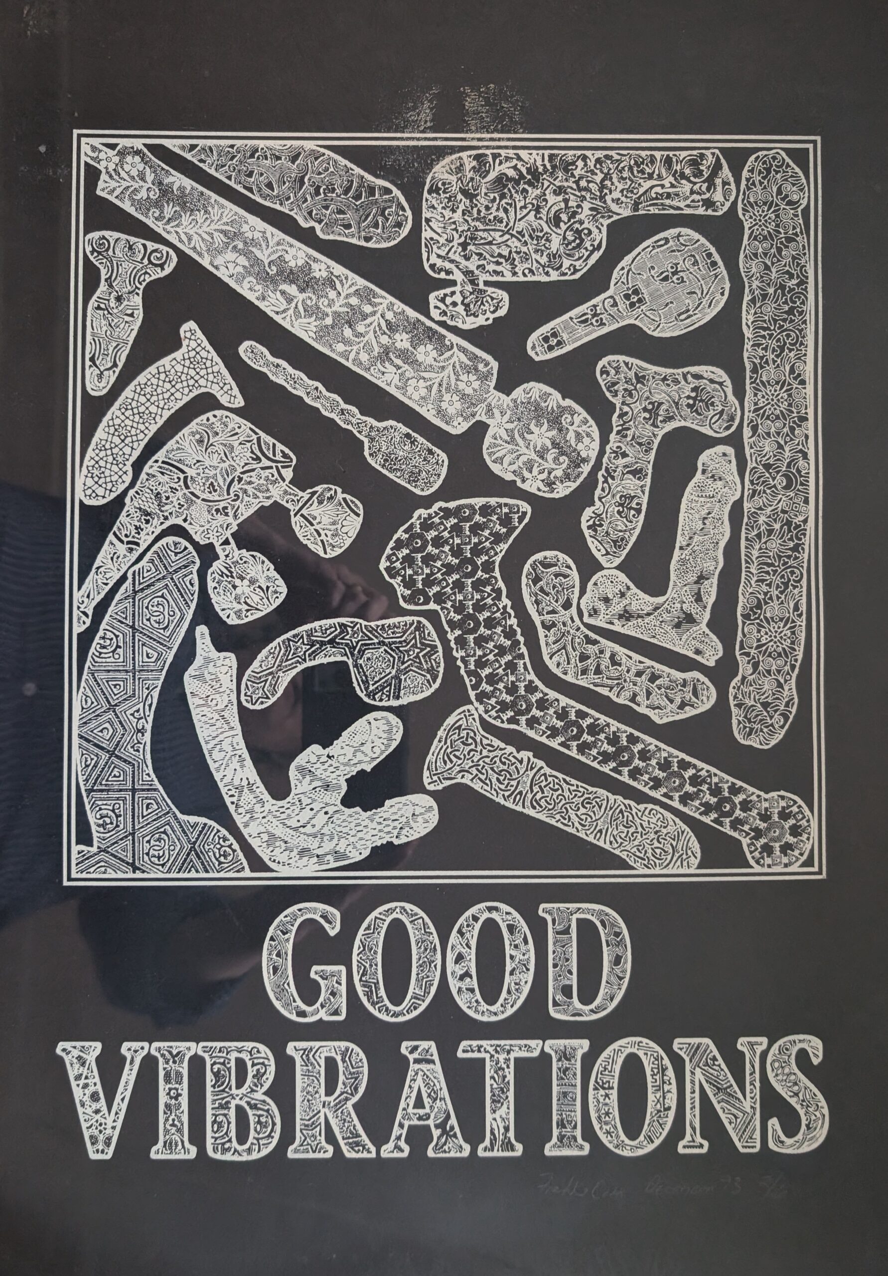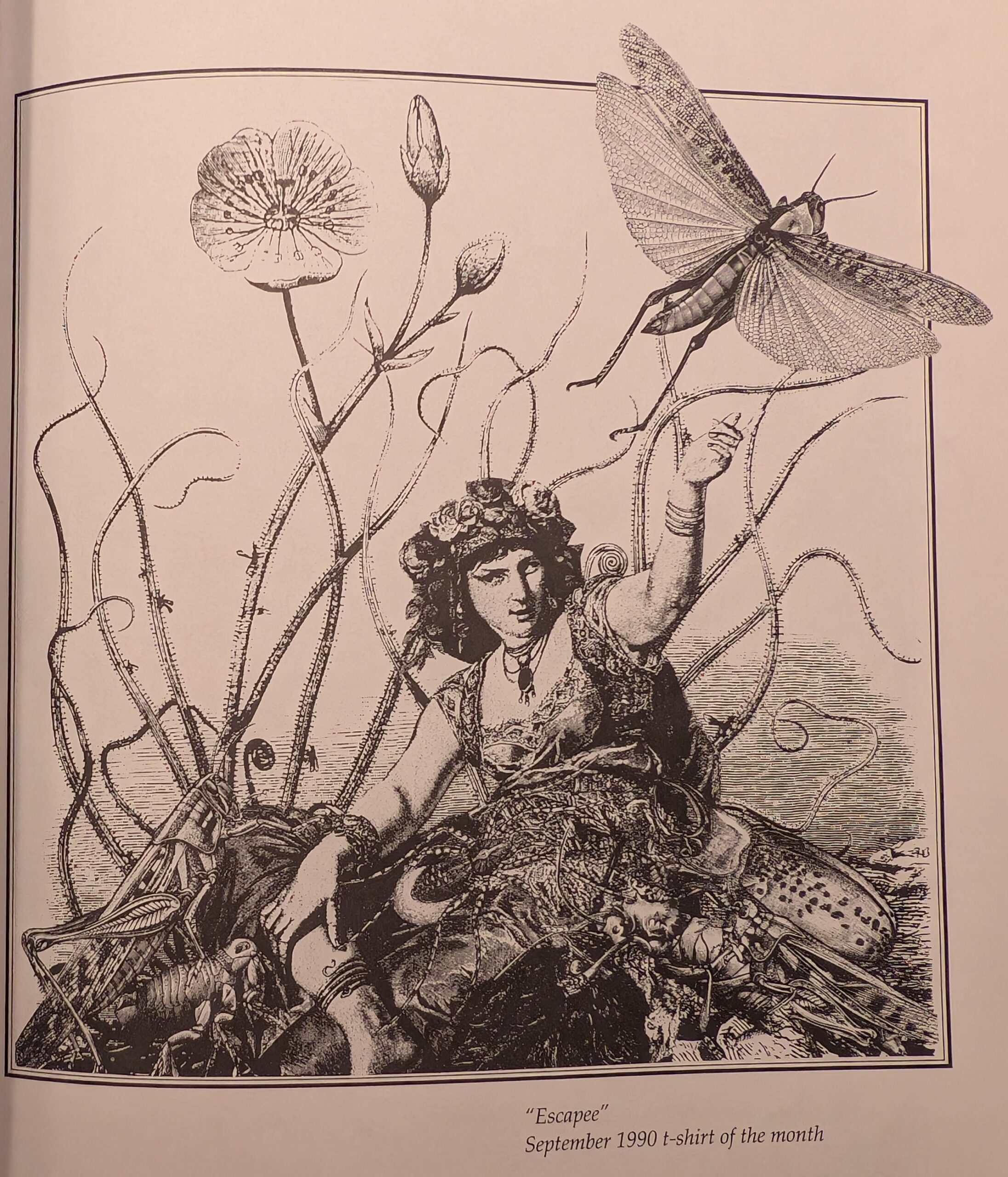 1990, “Music Has Charms…” Included in Ecstatic Incisions. This is a framed copy, hanging in Freddie’s home in Eureka. “Music Has Charms ….” August 1990 t-shirt of the month. Collage, included in Ecstatic Incisions p.31