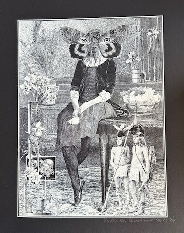 Freddie was a keen fan of Leonora Carrington’s, and “Homage to Leonora Carrington” was a work she kept framed by her bedside table. It was a collage for the May 1993 t-shirt of the month club.