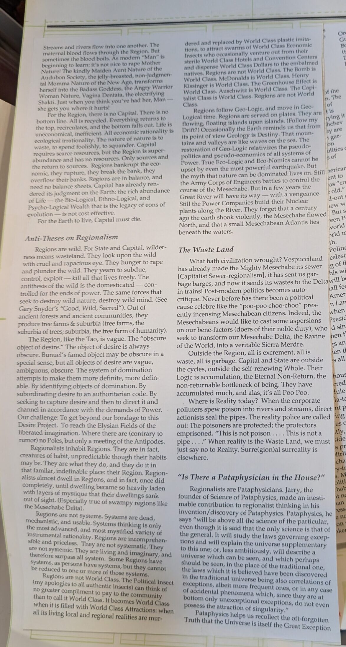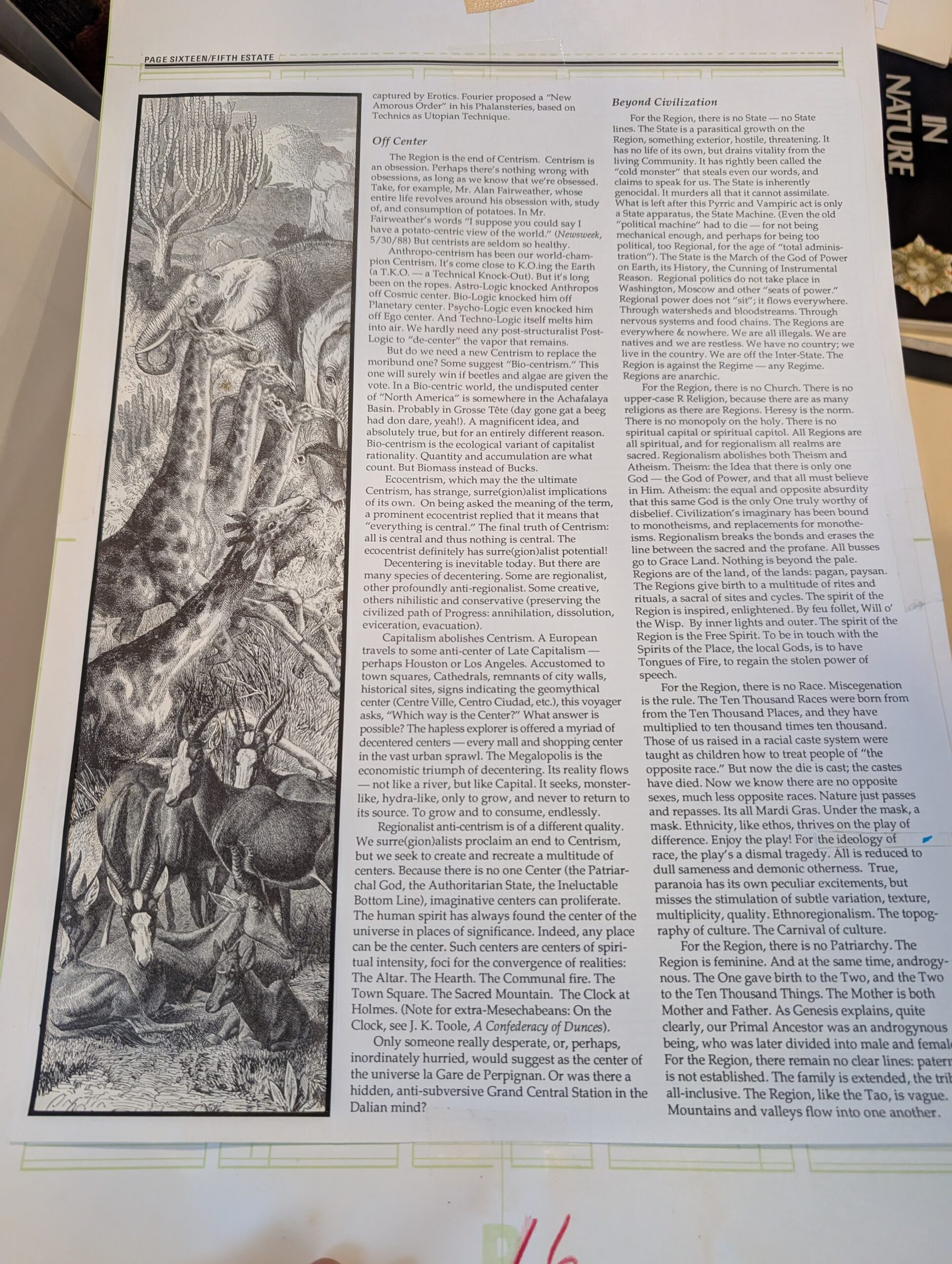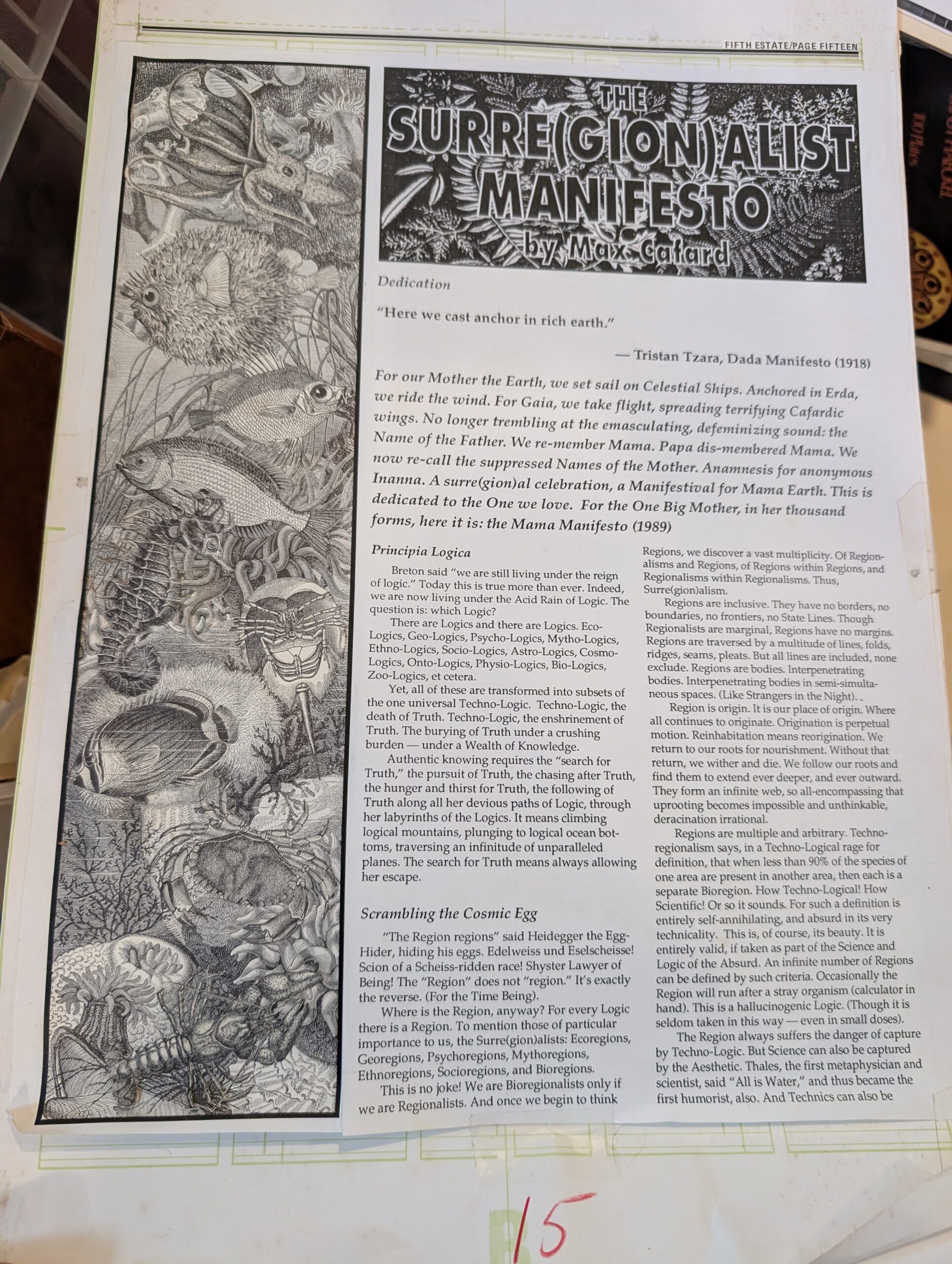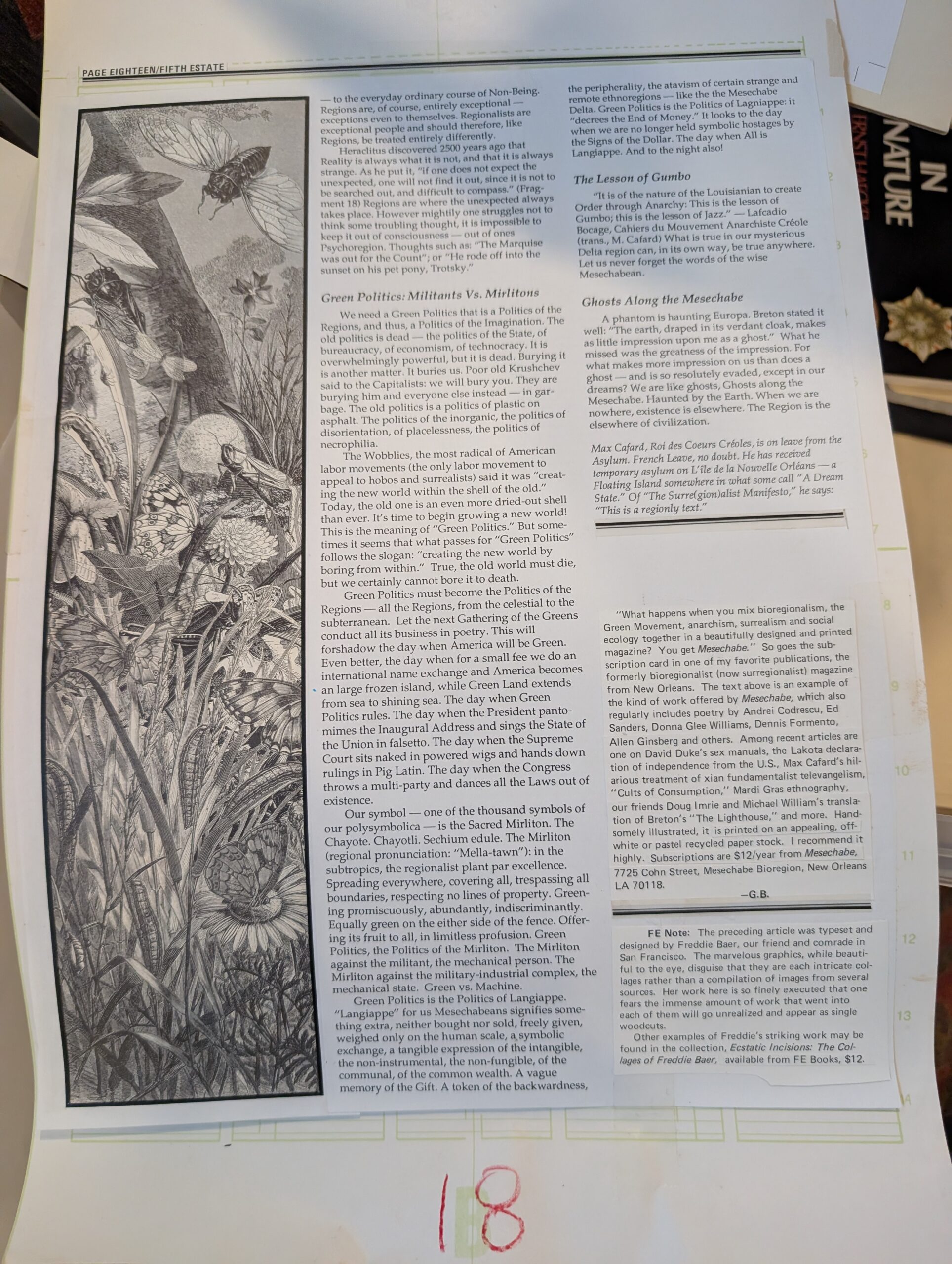 “The Surre(gion)alist Manifesto” is an essay by Max Cafard, which first appeared in Mesechabe 4/5 (1989), pp. 22-24, 32-35 and Exquisite Corpse in 1990. It was reprinted in Fifth Estate #341 (Spring 1993) with collage illustrations by Freddie Baer. We don’t have a clean scan of the Fifth Estate article yet, but here are some quick snapshots of the collage & layout originals.